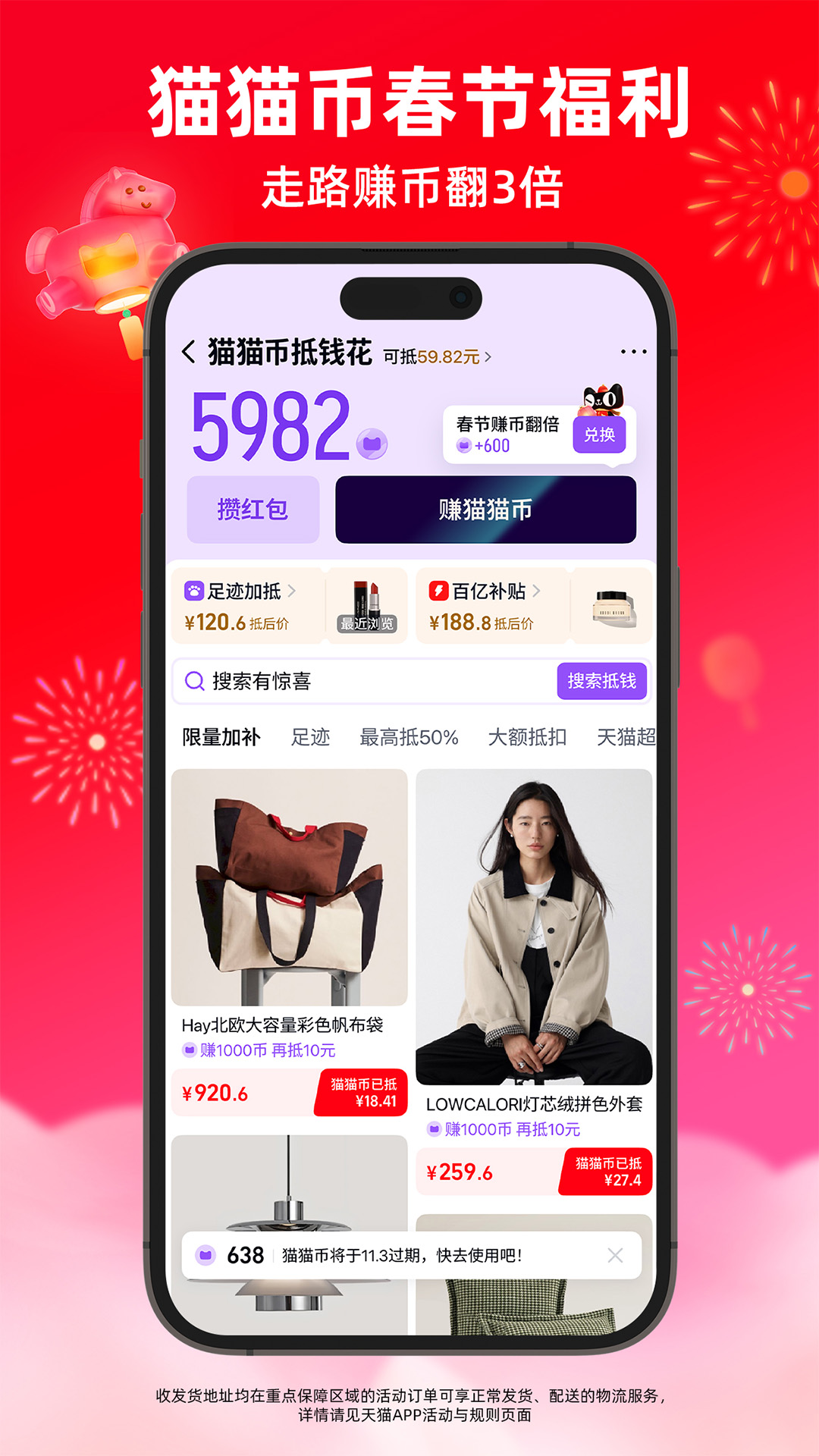 天猫(原手机天猫)是阿里巴巴集团旗下的购物APP。海量官方旗舰店正品保障,为您的品质购物保驾护航。天猫致力于满足消费者对品牌产品和优质商品的购物体验需求。在为消费者提供货真价实的产品的同时,持续创新售前服务并着力提升售后服务,努力打造成线上购物的品质地标,成为越来越多的消费者喜欢并值得信赖的网购平台。<br><br>【特色频道】<br>超神卡:淘宝铂金以上会员专享,每月必免1单!折上再享9.6折!每100元至高再返8元!<br>猫猫币:天猫下单即返猫猫币,海量商品下单可用猫猫币抵扣,折后再补至高50%,可叠红包叠消费券<br>多买多返:每单返1%,超神卡用户专享返2%<br>大牌闪购:爆款低价,整点抢红包<br>百亿补贴:大牌全网低价,限时买了就返红包<br>天猫超市:自营商品一次买齐送上门,致力于满足广大消费者全场景生活需求<br>天猫国际:全球好货新发现,为中国消费者提供全球的进口好物、直达海外生活方式<br>*具体以商品详情页展示为准<br><br>有任何问题和建议,您可以通过以下方式联系我们: <br>微博:@天猫APP <br>消费者热线:9510211 <br>手机天猫客户端:我-设置-意见反馈 <br>同样,您给的反馈意见,我们会加速优化改进!