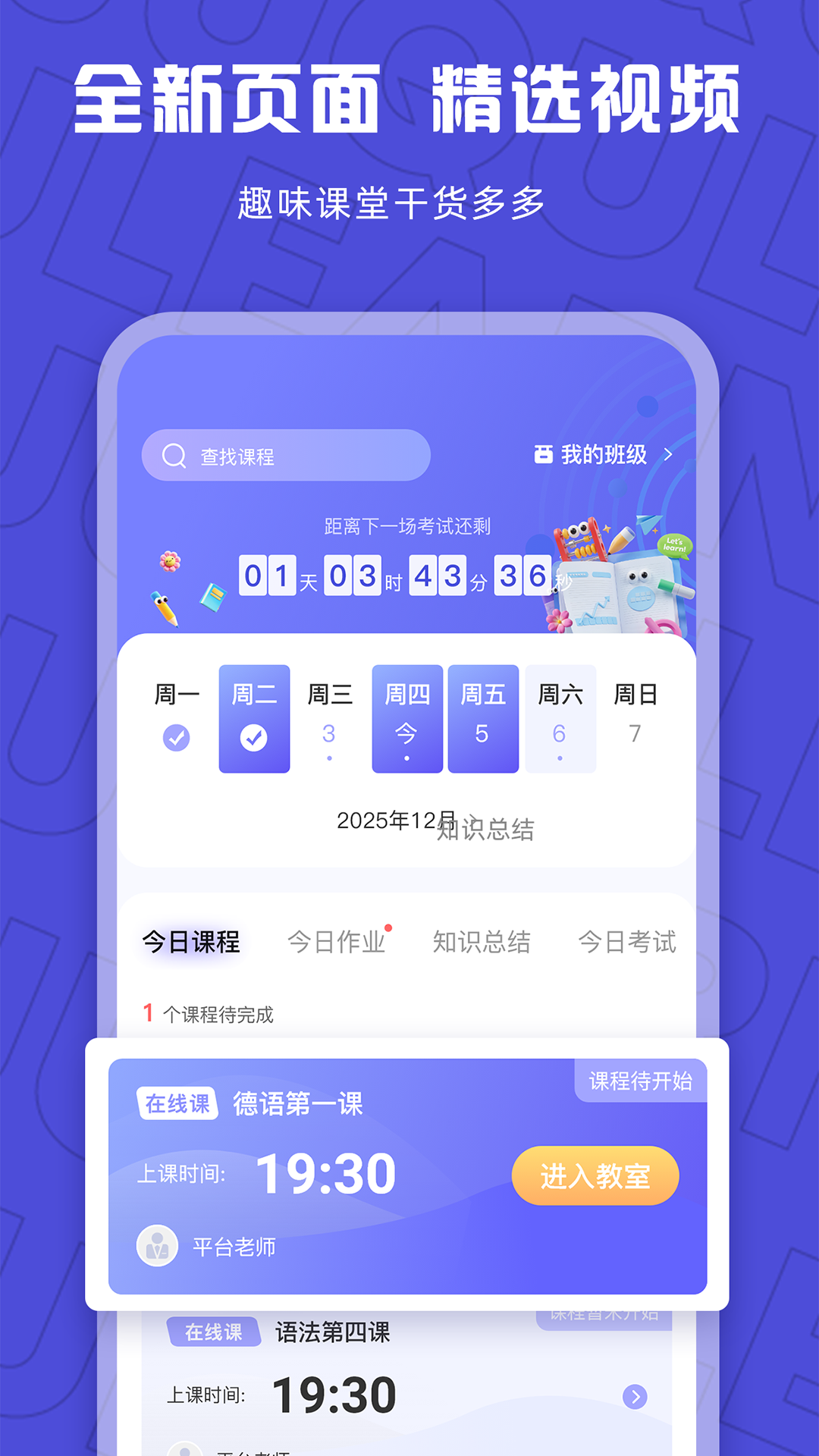 聚趣网校App是一款集在线德语,法语,韩语,日语,西班牙语教学为一体的学习软件。学员不仅能获得职场、兴趣、留学方面的培训,更能即时分享知识,收获学习伙伴。<br>使用手机、平板就能随时随地学习小语种,海量的名师讲解录制课程打开就可播放,还有多位高质量名师直播教学,是你在学习小语种路上的得力帮手。丰富的课程体系和学习系统,辅导老师课后答疑解惑,让您体验更有效的在线网课魅力!<br>【特色功能】<br>涵盖德、法、韩、日、西小语种课程任你选;<br>全方位教学服务:讲师+辅导+督学+课程规划师,4对1全方位助力学习,保证学习质量;<br>智能AI学习系统:上课+练习+测评,AI学习系统助力高效学习;<br>专业团队:留学名师,质量把控,多年教学经验,教师抽查机制,把握教学质量;