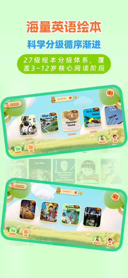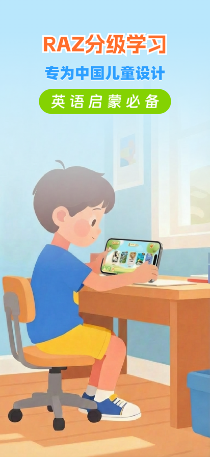 【产品简介】 本应用是一款基于RAZ体系、专为中国儿童设计的英语分级阅读APP。结合本土语言学习规律,将字母认读、自然拼读、句型理解与篇章阅读串联起来,为孩子规划从入门到流利阅读的清晰成长路径。 【海量分级绘本】 内置近千本高质量英文绘本与文章,覆盖科学、人文、自然、社会等20+主题。27个级别(aa–Z)由浅入深,从基础字母、简单单词到复杂句型和段落阅读,既夯实语言基础,又不断加入思维拓展与文化背景知识,真正做到“读中学、学中长”。 【听读与口语训练】 每本绘本均配专业美音朗读,支持逐句点读、跟读录音、回放对比及智能打分。孩子可以多次开口练习,在反复听读与模仿中纠正发音、提升语感,有效摆脱“哑巴英语”,同步提升听力与口语表达能力。 【课后练习与学习评估】 针对绘本中的核心单词与重点句型,配套记忆巩固练习和理解测试,读完就能检验掌握情况。系统自动记录阅读量、正确率和练习情况,生成可视化学习报告,帮助家长随时了解孩子的阅读进度与能力变化,及时调整学习规划。