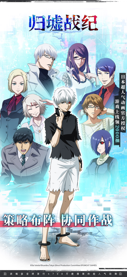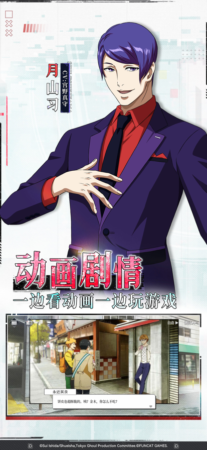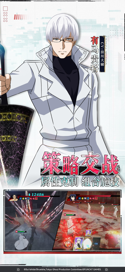 【世界观介绍】 东京,在这里生活着一群被称为“喰种”的怪物,他们潜伏在人群之中,狩猎人类。喜爱读书的金木研在常去的咖啡店“安定区”里,遇见了某位女性。不管是年龄、境遇和阅读兴趣都相同的两人逐渐彼此亲近,但是……在书店的约会后,金木研被卷入了改变其命运的事故之中,被迫移植了“喰种”的器官…… 金木研一边对这个扭曲的世界保持着疑惑和纠结,一边被卷入一连串无法逃离的恶性循环中。 【游戏介绍】 ◆众多角色登场 藉由3D模型重现角色充满跃动感的白热化战斗场面。 可用70名以上的角色组建梦幻阵容! ◆重温超人气动画剧情 以3D角色模型重现那些经典名场面! 一起来体验这个至今仍不褪色、充满魅力与矛盾的世界吧! ◆充满战略性的战斗 必杀技的发动时机和角色搭配是决定胜负的关键! 技能施放顺序和必杀技的发动时机等战略要素,也可能颠覆战局! ◆丰富的游戏内容 描绘了“纠结于人类和喰种之间”的剧情。 BOOS讨伐战、突破封锁、无尽试炼等多种激爽玩法解锁你的战斗DNA! PVP竞技刺激对抗,安定区咖啡店轻松休闲......超多游戏玩法等你来体验!