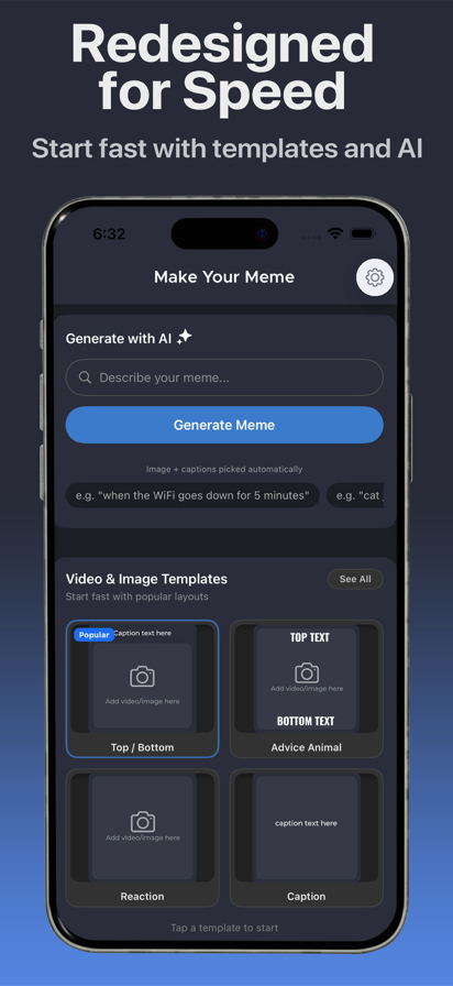 Meta Meme - AI Meme Generator & Editor Meta Meme is a powerful meme editor with built-in Generative AI that creates actually funny memes — not generic AI slop. Generate memes using AI trained on real meme formats, then fine-tune everything with pro-level editing tools. This is the fastest way to go from idea → viral-ready meme. GENERATE MEMES WITH AI (Pro) - Instantly generate memes using Generative AI - AI pulls from real meme formats and styles - No random images, no low-effort captions - Edit, customize, and export instantly Use AI when you want speed. Use Meta Meme’s editor when you want control. CREATE WITH VIDEO OR IMAGE - Use videos from your photo library - Use images from your photo library - Search and use GIFs from GIPHY - Video features require Pro UNLIMITED IMAGES & CAPTIONS - Add unlimited images to a single meme (Pro) - Add unlimited text labels - Full control over positioning, size, and rotation - Browse the Meme Image Library with hundreds of images VIDEO & GIF TOOLS (Pro) - Search GIFs by keyword (via GIPHY) (Pro) - Trim video start and end times - Export high-quality video memes - Video features require Pro OBJECT TRACKING (Pro) - Pin text or images to moving objects in video - Text and stickers follow the object automatically - Perfect for labeling people, objects, or anything that moves MEME TEMPLATES - Multi-label templates - Multi-image layouts (side-by-side, grids, vertical, and more) - Free classic templates (Top/Bottom Text, Advice Animal, etc.) (Some templates require Pro) Popular preset memes like: - Drake - Distracted Boyfriend - Expanding Brain - Is This a Pigeon Trending current memes like: - Trolley Problem - Bell Curve - Two Paths - Chill Guy FULL CUSTOMIZATION - Resize, crop, and reposition images or video - Dozens of fonts - Full control over font size and color - Choose any background color - Add stickers CUSTOM WATERMARK (Pro) - Add your own text or image watermark - Use your logo - Customize size, color, position, and rotation - Remove the default Meta Meme watermark Go Pro to Unlock Everything - Generative AI meme creation - Create video memes - Unlimited images and text labels - Custom watermarks - All premium templates - Full meme image library - No default watermark Subscription Details - Subscriptions are charged to your iTunes account - Auto-renewing unless canceled at least 24 hours before renewal - Manage or cancel anytime in Account Settings - Free trials convert to paid subscriptions unless canceled - Privacy Policy: https://meta-meme.com/privacy - Terms of Service: https://meta-meme.com/terms Create your own memes for free. Generate smarter. Edit deeper. Download Meta Meme.
