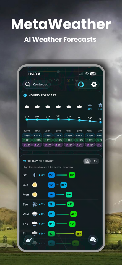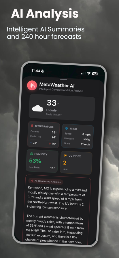 Forward thinking. Intelligent. Accurate: - AI incorporated throughout the app- AI daily summaries, AI current conditions, etc. - Radar - Alerts - 10 day outlooks - 100 hour forecasts - Current conditions - Themes - Custom app icons - Customization - Widgets - Weather reports - Weather blog - AI Assistant - Data from Apple Weather Everyone on Earth— from the USA to Europe to Asia and beyond— has been keep in mind. We support global locations and custom units for temperature, speed, visibility, and measurement. The blog focuses on global weather headlines. Radar is supported worldwide. This isn’t just your standard weather app. Our goal is not to compare- it is to contrast. This is a unique experience designed for the mid-2020s and beyond. Forward thinking. Simply. Powerful. MetaWeather. -- You may purchase an auto-renewing subscription through an In-App Purchase named MetaWeather+. • Auto-renewable, 1-month subscription • Privacy policy and terms of use: https://nathanranthony.wixsite.com/metawx