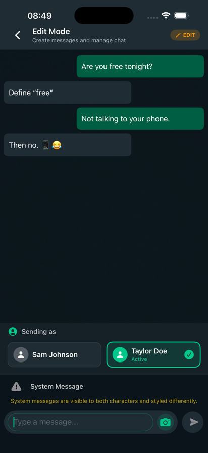 一款支持同人创作、用户至上的界面故事生成器 我们直观流畅的界面让定制聊天对话变得轻而易举——无需任何技术技能。无论您想创作聊天小说、短信AU,还是让心仪角色展开天马行空的对话,FauxChat都能让您直接投入故事创作,尽情释放想象力。 无限叙事可能 精心设计对话的每个细节,完美契合您的创作构想。自定义聊天场景、参与者、用户名及消息内容,适配您钟爱的同人圈、AU世界观或原创角色阵容。 可扮演对话双方角色,全面掌控对话走向——无论是CP互动调侃、新组建的家庭群聊、充满忧郁的深夜私信,还是天马行空的脑洞对话小说,皆游刃有余。 添加表情符号、图片和动态反应,让虚构对话真实生动,宛如真实通讯软件中的交流。 导出与分享你的聊天小说 对话完成后,可将完整聊天记录导出为高清图片。完美适用于AO3、Wattpad、Tumblr、Twitter/X等平台分享,亦可保存用于灵感板、小说宣传或创意项目。 免责声明 FauxChat是一款创意叙事应用,专为构建角色间的虚构互动对话而设计。所有对话纯属虚构,仅限于同人创作、角色扮演及创意表达用途。严禁利用本应用欺骗、冒充或误导真实人物。本应用仅用于娱乐及故事创作目的。