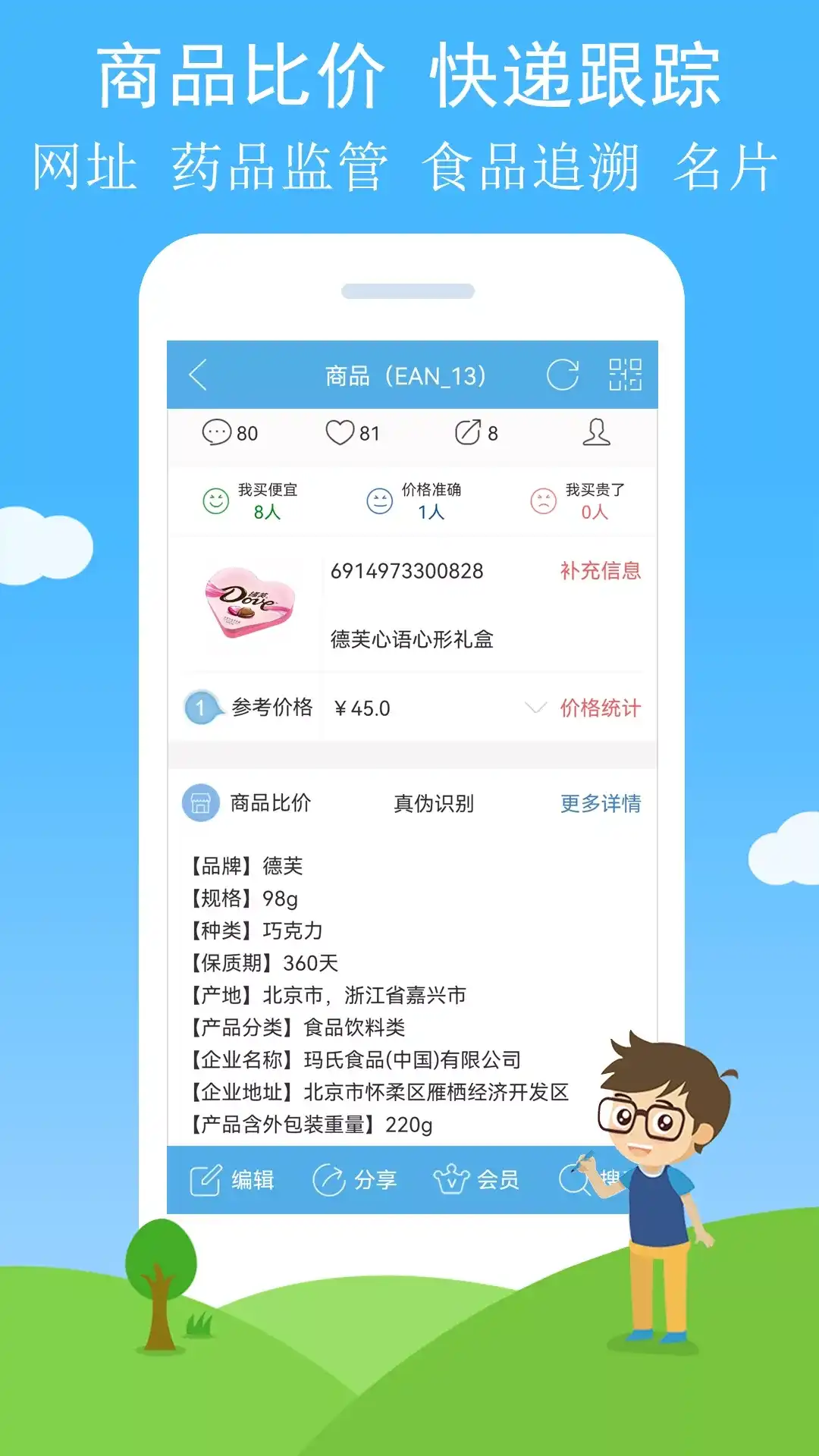 二维码与条形码是商品比价、快递跟踪、药品监管、查验真伪、发票扫描、食品追溯、制作和美化二维码条形码的必备神器。 (1)扫码制码类型超多,支持商品、书籍、快递、药品监管码等条形码,还支持文本、发票、食品追溯码、网址、名片、短信、WiFi、电话、邮箱、地点、日程等二维码; (2)商品比价,扫一扫条形码即可了解商品参考价格和其他详细信息,一目了然; (3)制作二维码和条形码图片,可对Logo、颜色、背景、码眼等进行美化设计; (4)扫码和制码历史记录功能,按来源和类型进行统一管理,方便快捷查找记录。 ======我们期待你的声音====== 对于二维码与条形码的任何建议,欢迎随时联系我们 官方网站:http://m.uquba.net 官方QQ群:514256541 官方邮箱:colorful@uquba.net