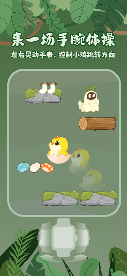 《小鸡跳跳跳》是一款刺激好玩的垂直跳跃手表游戏,灵感源自经典《涂鸦跳跃》!玩家化身勇敢贪吃的黄色小鸡,开启无限向上冲刺之旅! 核心玩法: 多类型跳板:从固定石阶到移动木条,从易碎蛋壳到弹力蹦床蘑菇,每一次跳跃都是全新挑战! 丰富道具系统:利用弹簧蘑菇鞋、大葱火箭、蒲公英竹蜻蜓和保护罩,突破极限! Q萌怪物图鉴:躲避并踩扁老鼠怪、萝卜怪、喷火茄子怪等敌人,获取额外高分! 操作简单直观:左右倾斜控制小鸡跳跃方向,轻松上手,无限挑战! 享受射击乐趣:点击屏幕可以发射子弹,子弹打破口粮保护罩让小鸡吃到口粮可以获得额外加分 策略选择:也可以用子弹打掉怪物,不过这样就不能额外加分哦。 挑战高分:躲避障碍,向上跳跃,不断刷新个人纪录,冲击全球排行榜! 这是一款完美的休闲、单机、可离线运行的手表游戏,专为 Apple watch 性能优化。 适合所有年龄段玩家。立即下载《小鸡跳跳跳》,让小鸡在你的手表里跳一跳,开始你的空中冒险,你能跳多高?