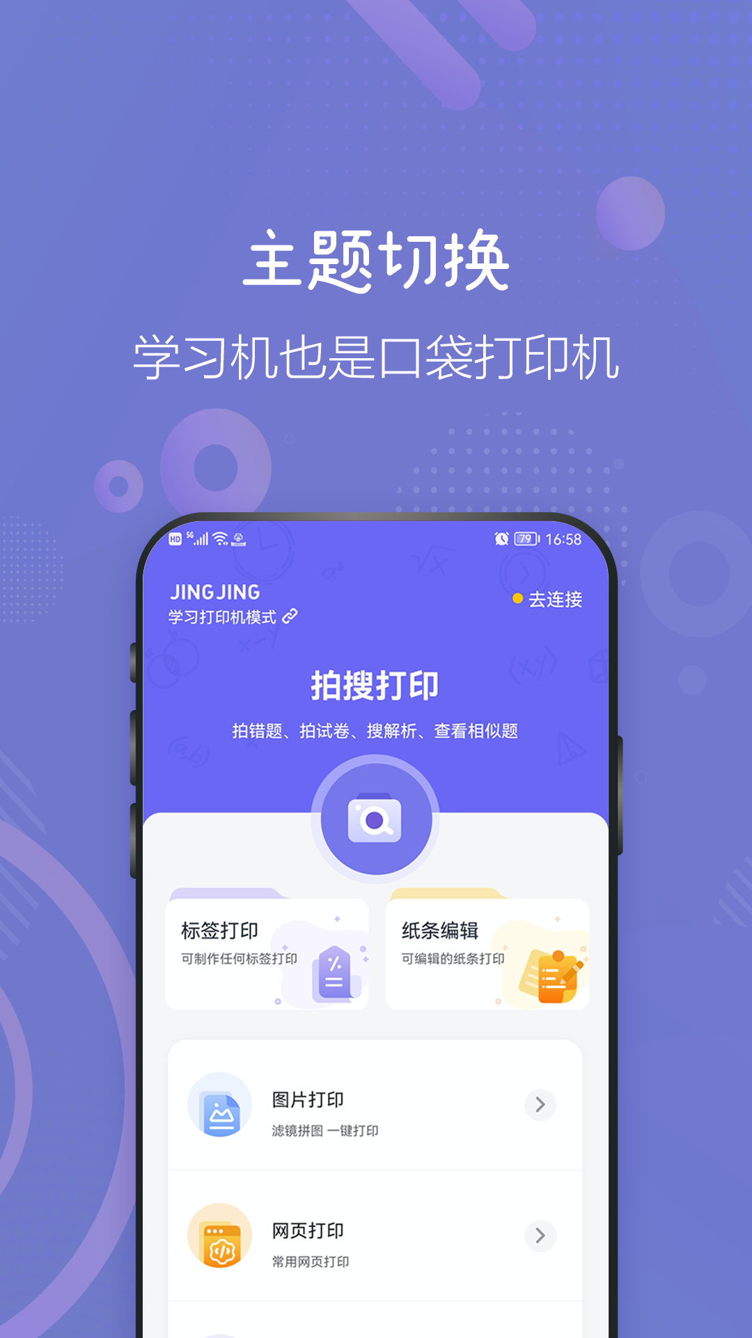 井井打印是一款适用于学习教育、日常生活等综合场景的APP,它可通过蓝牙连接井井学习打印机,实现手机操控打印机无墨打印,随身随行,装纸即打。欢迎各位下载使用。<br>产品功能介绍:<br>【学习教育】<br>错题打印:通过拍摄或选取手机相册中的题目,直接打印,错题不用抄,节省抄题时间,留更多时间进行解答、复习和预习,效率大大提升,事半功倍。<br>搜题打印:拍摄或选取手机相册中的题目,秒出解答,对接5000万师生使用,日均新增4000题的题库源,并且可以选择题目、答案、考点、分析、点评按需打印,根据错题本纸张大小可调节横屏或竖屏打印。<br>智能错题本:云端的错题本,线上累积和管理个人的错题,不限错题本和题目数量,不会因为更换手机设备而丢失,随时复习。<br>【日常生活】<br>图片打印:打印手机相册或拍摄的图片,可以对图片进行裁剪、旋转、亮度和对比度的处理。<br> <br>纸条编辑:图文混排,多样字体可选,可打印清单、照片,做手账,做攻略,日常打印方便省心。