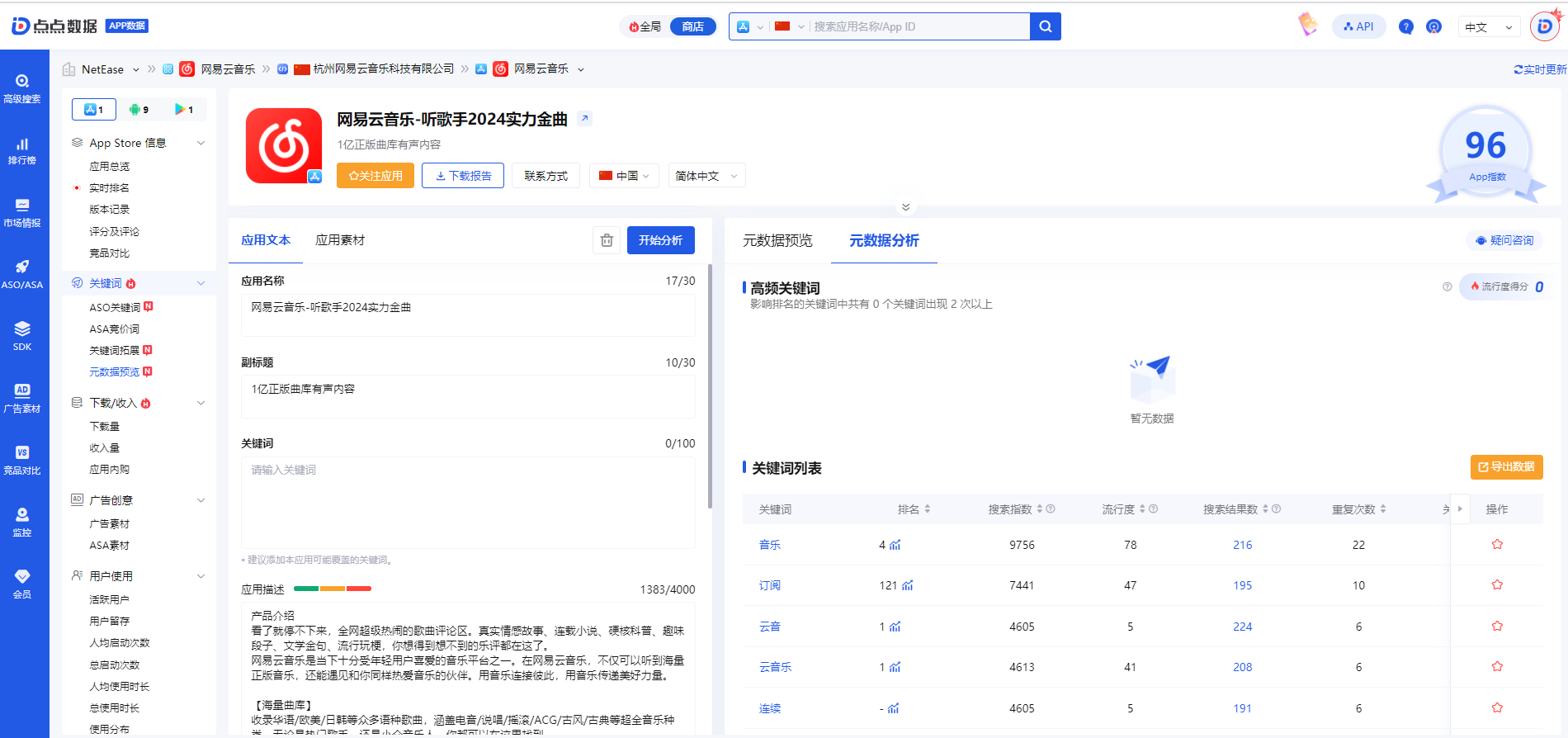 用户只需点击“开始分析”按钮,即可对元数据文本进行全面分析。系统会显示应用文本所覆盖的关键词,开发者可以根据分析结果进行调整,有效覆盖更多关键词。