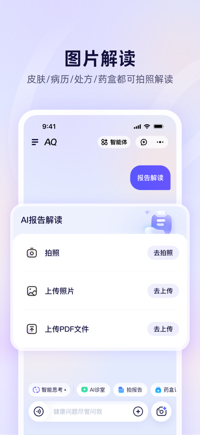 蚂蚁集团开发和运营的医疗健康AI应用,为用户提供各类健康咨询、图片解读(报告、病例、处方、药盒均支持)、个人和家庭健康档案管理及各类医疗健康服务,如预约挂号、云陪诊等。请注意,AI 答复内容仅为参考,不能替代专业医生的诊断和治疗建议,请视自身情况及时就医咨询。