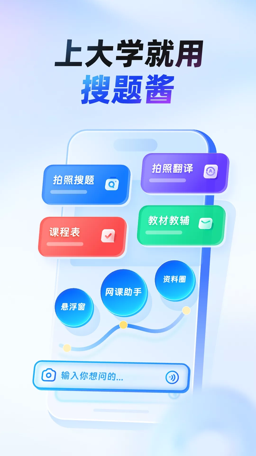 大学搜题酱 App是一款大学生专属的AI学习助手。网课答案、教材习题、答案解析一拍即出,搜题不限次。现已经接入DeepSeek,豆包,文心一言,kimi等大模型,助力大学生的学习更上一层楼。搜题酱涵盖千所高校期末真题,收录四六级考研考公等各类试题资料。有了搜题酱,大学难题从未如此简单! 【大学搜题酱功能】 1、AI问答:生活百科,学习难题,工作帮手,有问就有答。 2、拍搜答疑:遇到难题怎么办?用拍搜答疑功能,一拍即出答案,解题又快又准! 3、文字搜索:不方便拍照不要紧!使用文字搜索,题目一键复制粘贴,搜索更便捷! 4、找答案浮窗:手机在线答题如何查答案?开启找答案浮窗,截屏搜题更方便! 5、资料库:大学考试不要慌!来大学资料库,各类考试真题、复习资料免费下载。 6、扫码搜书:专业课后习题不会答?扫条形码即出整本教材书籍,遇到难题无压力。 7、收藏:一键收藏所需教材网课,查找更方便,使用更简单。 【大学搜题酱特点】 1、题目全:收录大学各专业教材、网课、进阶考试的题目答案,海量优质题库免费搜。 2、搜题快:支持搜索答疑、文字搜索、扫码搜书等多种搜索方式,一拍一扫,即出答案!