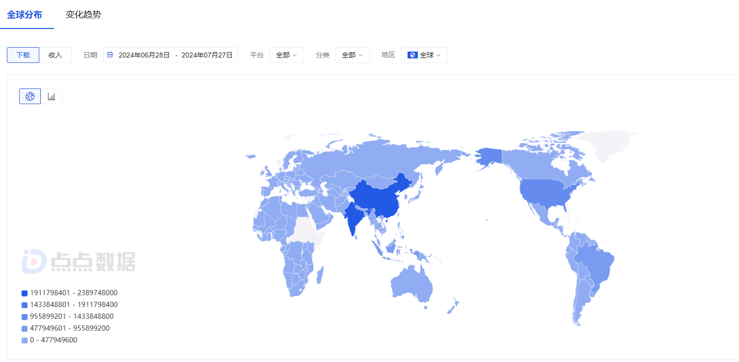 全球分布:全球视角洞察地域差异,点点数据助力精准投放。掌握全球不同应用类别的收入与下载分布,洞悉用户偏好,为开发者制定地区化推广策略提供数据支持。