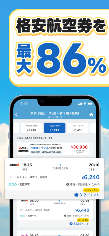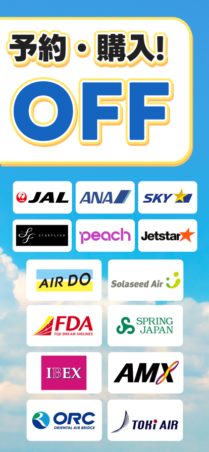 航空券/飛行機チケットの予約なら エアトリ!! 航空券/飛行機チケットを比較して、簡単・便利に飛行機を予約しよう! 飛行機や新幹線のチケットも、ホテルもツアーも、旅行の全てを予約できるアプリです。 ◆エアトリの予約サービス一覧◆ 国内航空券、海外航空券 エアトリプラス(国内の航空券+ホテル、海外の航空券+ホテル) 国内・海外ホテル 国内ツアー、海外ツアー 新幹線、レンタカー、新幹線+ホテル、高速・夜行バスチケット、Wi-Fi・eSIM、アクティビティ、キャンプ・アウトドア ◆航空券/飛行機の予約なら-エアトリ 格安航空券で楽しく旅行はこんな方におすすめ ・航空券/飛行機チケットの予約アプリを探している ・格安航空券を比較して予約したい ・旅行に行く予定があり、格安航空券を探している ・国内旅行のホテルや航空券/飛行機チケットを格安で予約したい ・海外旅行に行くためにホテルや航空券/飛行機チケットを比較して予約できるアプリを探している ・旅行や出張で泊まるホテル探しをアプリでしたい ・どのアプリを使ってホテルや航空券/飛行機チケットの予約をしたら良いかわからない ・旅行で泊まるホテルを比較しながら検索して予約できるアプリが欲しい ・格安のホテル/ツアー/新幹線のチケットなど旅行のいろいろを予約できるアプリを探している ・旅行に行きたいが航空券/飛行機チケットの価格を見て目的地を決めたい ・どこでも、いつでも旅行に必要な航空券/飛行機チケットやホテルの予約をしたい ・航空券/飛行機チケットとホテルを同時に予約したい ◆国内すべての航空会社を予約できる 日本航空(JAL) 全日本空輸(ANA) スカイマーク(SKYMARK) ジェットスター(Jetstar) Peach(ピーチ) スターフライヤー(SFJ) ソラシド エア エア・ドゥ(AIR DO) SPRING JAPAN フジドリームエアラインズ(FDA) 天草エアライン オリエンタルエアブリッジ IBEXエアラインズ トキエア ◆主要就航空港一覧 羽田空港(東京国際空港)、成田空港(成田国際空港)、伊丹空港(大阪国際空港)、関西空港(関西国際空港)、新千歳空港(札幌空港)、セントレア空港(中部国際空港)、福岡空港、鹿児島空港、那覇空港 ◆海外で人気の渡航先もエアトリで簡単予約 ソウル(韓国)、タイペイ(台湾)、バンコク(タイ)、ホノルル(ハワイ)、香港、シンガポール、上海、グアム、パリ、ロンドン、ロサンゼルス、ニューヨークなど ◆お問い合わせはこちらまでお寄せください。 https://www.airtrip.jp/guide/domesticair/contact.php