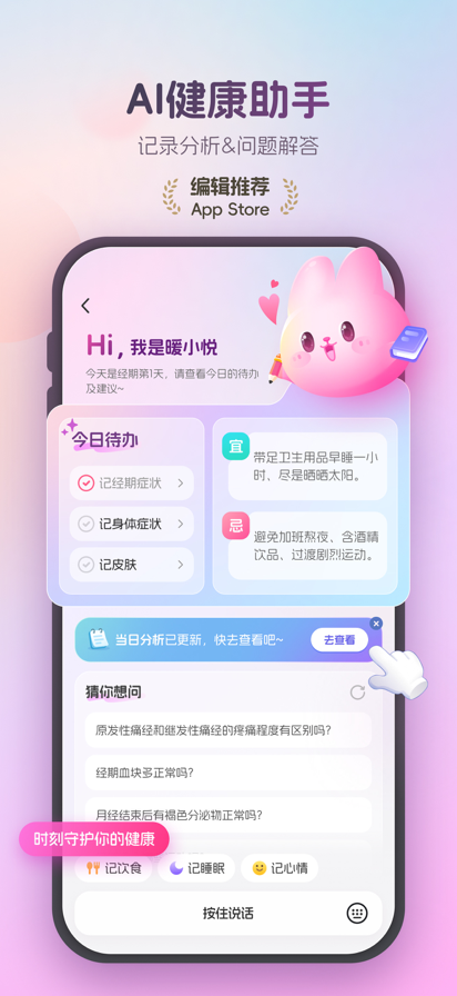 *** App Store编辑推荐的女生必备健康App *** *** 数万真实用户给出4.9高分评价 *** 暖悦App,陪伴,记录,更懂你 这是你的生理期记录小助手,是女生和女人必备的工具~ * 全周期分析功能,精准智能预测经期。行业独有的AI智能分析功能,结合多维度的记录信息,给出精准经期预测、智能推算排卵日、提供生活建议! * 支持多样化记录,体温体重、饮食饮水、运动健康信息全面掌握 * 聊天对话、知识科普、问题咨询、随时解决你的健康疑问 * 简洁优雅的UI设计,完全无广告的清爽体验,都市女性手机上的不二之选! * 无需实名、保护隐私、不和任何个人信息关联。 快来下载体验看看吧,包你用过就停不下来~ 免责声明 暖悦App所提供的健康方案仅供参考,用户若患有疾病、长期服药或其他可能会影响健康方案执行的,应当根据自身的健康状况自行评估,必要时需在医生或其他医务人员的指导下进行。暖悦App提供的任何方案,均不能代替医生和其他医务人员的诊断和建议,暖悦App也不会提供任何医疗诊断或医疗建议。如果您遇到任何健康问题,除使用本应用之外仍必须需寻求医生建议,并在做出任何医疗决策前咨询专业意见。 -- 隐私政策: https://cdn.gameley.cn/ftp/XXMZYS/womens/Private.html -- 用户协议:https://cdn.gameley.cn/ftp/XXMZYS/womens/userPrivate.html — 官方网站:https://wm.gameley.cn/