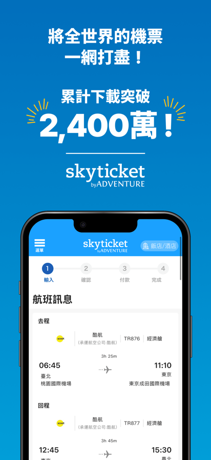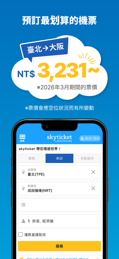在 skyticket.com 上搜索并预订全球优惠机票与酒店住宿。 来自世界各地的旅客都在使用 skyticket! 轻松预订廉航特价机票,也能选择您喜爱的航空公司,以最低票价飞往世界各地! 在线预订只需 5 分钟,24 小时服务,全年无休。 支持多种货币支付! 立即下载 skyticket App,开始预订最优惠的机票吧!