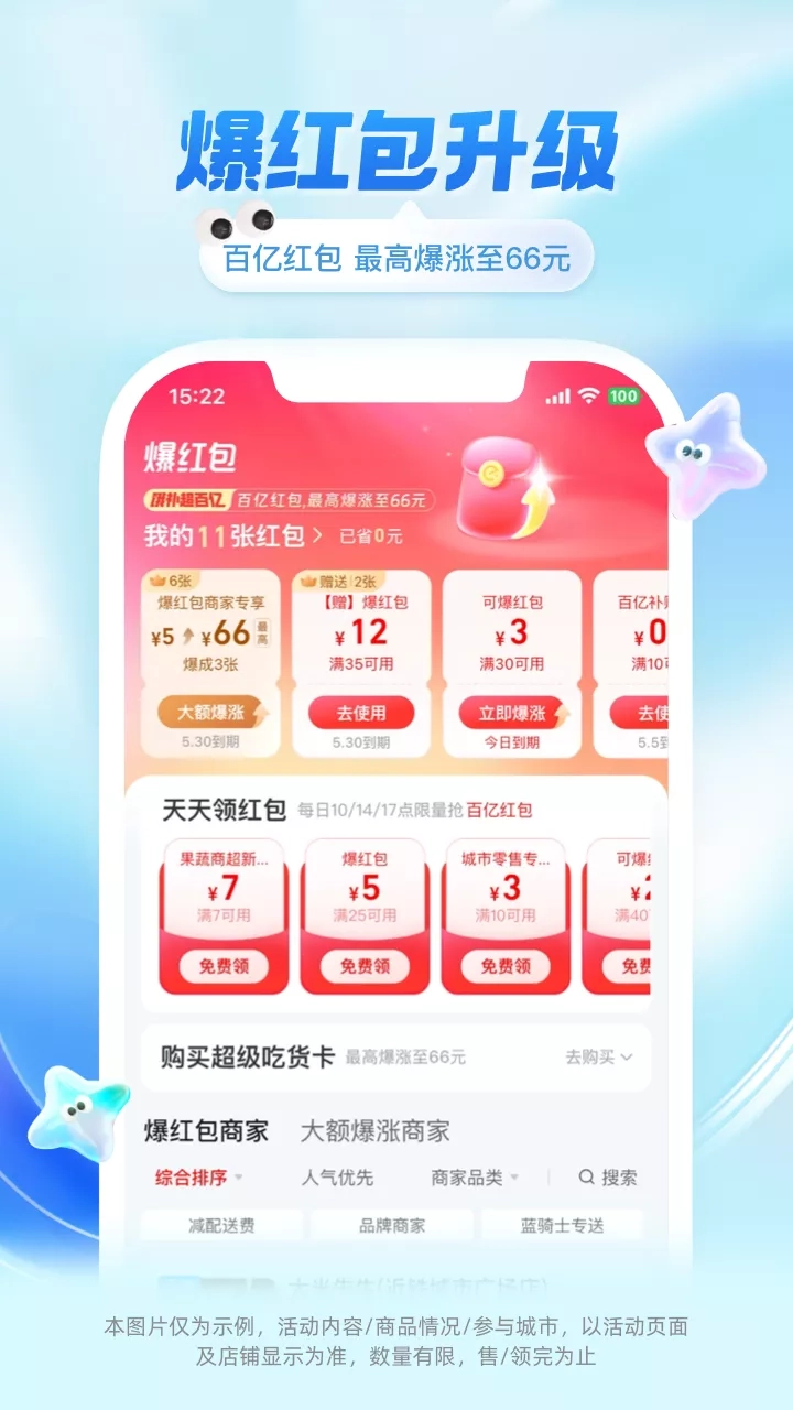 饿了么致力于在快节奏的生活里,让你可以放心点、准时达。 方便好用的生活APP! 【好的都要 随叫随到】品质美食、水果生鲜、鲜花蛋糕、超市百货,跑腿配送,准时送达! 【新人福利】新用户有机会领20元大额红包! 【优质服务】极速配送,超时赔付,为你甄选资质齐全,卫生可靠的优质商家,提供安全、方便、快捷、贴心的高品质外卖服务。 【全区域,全品类】 网罗周边各类外卖,中餐、西餐、快餐、简餐、火锅、烧烤、烘焙、汉堡、早餐、下午茶、夜宵、甜点、甜品、水果、鲜花、果蔬、生鲜、蛋糕、寿司、咖啡、超市购物……各类特价优惠套餐、满减折扣优惠、立减优惠套餐,便捷生活,一手掌握,尽在饿了么! 【特色功能】 搜罗附近外卖美食,预约订餐; 及时通知外卖状态,准时送达; 智能筛选排序餐厅,方便点餐; 各种满减打折活动,优惠不断; 外卖美食照片点评,吃出乐趣; 用饿了么,一切尽在掌握!还在等什么? 马上体验安全优质的本地生活服务吧! 【联系我们】 官方微信:饿了么网上订餐(elemeorder) 官方微博:饿了么网上订餐 客服热线:1010-5757