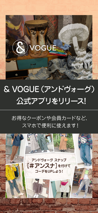 札幌を中心に旭川・苫小牧・釧路でショップを展開する & VOGUE(アンドヴォーグ)のアプリです。 & VOGUE(アンドヴォーグ)で展開する各店舗でご利用できます。 mint package(ミントパッケージ) sucre & Vogue(シュクールアンドヴォーグ) & candy.r(アンドキャンディアール) & VOGUE(アンドヴォーグ)はファッション、ライフスタイルにこだわりを持ち続ける全てのお客様へ、今欲しいアイテムを自らの価値観でチョイスできる空間と商品を提供します。個性的な雑貨・家具・アパレルを幅広く取り揃え、程よい上質感とクオリティーでライフスタイルコーディネートを提案いたします。 【& Vogueアプリの便利な機能】 ≪アプリでスタンプ貯めよう!≫ 商品のご購入で、ご購入金額に応じてスタンプを付与します。 お店でスタッフが提示するQRコードを読み込むだけでスタンプがGETできます! スタンプを集めて満了すると、お得な特典あり! スタンプカードは貯めたスタンプ数に応じてランクアップ! カードのランクアップと同時にクリアした時の特典もランクアップします! ≪ 知りたいニュースがすぐに見つかる!≫ & Vogueからの「商品入荷」や「イベント情報」など、トレンド情報が満載!! よくご利用する店舗をお気に入り登録すると、店舗限定のお知らせが届きます! 気になるニュースを見つけたら、ぜひお近くの店舗まで足をお運びください! ≪アプリ会員限定お得なクーポン配信!≫ & Vogueでのお買物がお得になるクーポンを配信。 その他にも誕生日の月に届くお得なクーポンやスタンプ満了特典で貰えるクーポンなど便利にご利用いただけるサービスです!! 不定期の配信となりますので、お見逃しなく! ≪オンラインショップでお買い物!≫ & Vogueのアイテムが店舗だけでなくアプリからもかんたんに購入できます! アパレルはもちろん、雑貨やインテリア、家具に至るまで面白いアイテムをチョイスしています。 季節に合わせた限定トレンドアイテムぞくぞく入荷! ≪& Vogueオススメコーディネート≫ スタッフの「おすすめ」コーディネートだけでなく、 み人気の着こなしを探せます 「& Vogue」アイテムを使った、季節に合わせたトレンドコーデを紹介します!ぜひ、毎日のコーデの参考にしてみてください。 【注意事項】 ●このアプリは、インターネット通信を利用して最新情報を表示します。 ●機種により、ご利用いただけない端末がございます。 ●本アプリはタブレットに対応しておりません。(一部機種によってはインストール可能ですが、正常に動作しない場合がございますので、あらかじめご了承ください。) ●本アプリをインストールする際には、個人情報の登録は必要ございません。各サービス利用の際にご確認のうえ、情報を入力してください。