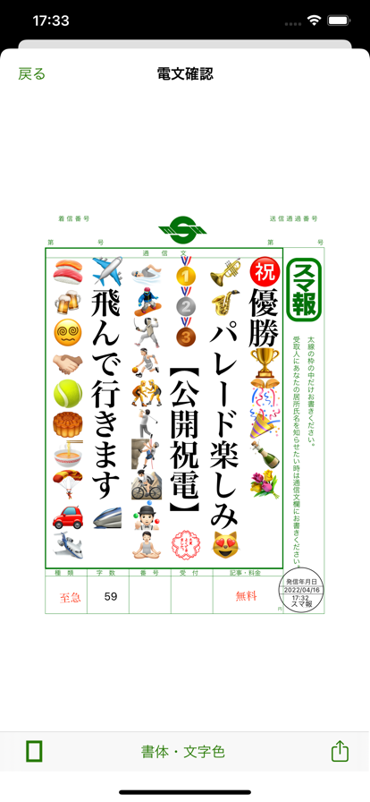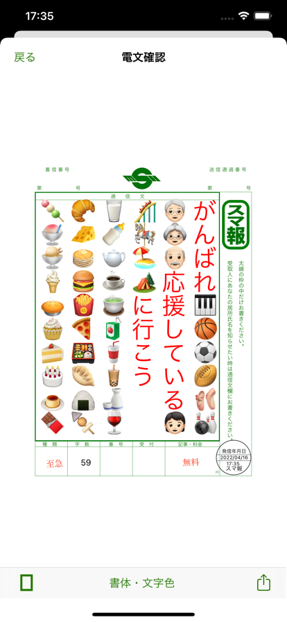 スマホで電報あそび 『スマ報』 スマ報は電報形式の画像を発信するツールです。 いにしえの通信手段がスマホで蘇りました。 公開祝電はもちろん、応援、激励、催促、仲直りなどにも活用してください。 普段は言いにくいこともカタカナの電報にしてしまえば言えるかも知れません。 電報画像は文字が大きいので絵文字も映えます。 画像は縦長のほかに正方形も選べます。 カメラロールへ画像として保存やAirDorpで共有もできます。 (カラー絵文字には文字色指定はできません) VoiceOver操作に対応しています。 ※「電報」は各家庭に電話が普及する以前に使われていた通信手段です。当時は仮名のみでしかも文字数で課金されたため『カネオクレ』のように要件のみを簡潔に書いていました。