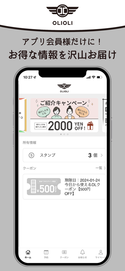 【美容カイロ OLIOLI】の公式アプリが登場!! アプリを通して【美容カイロ OLIOLI】の新着情報やお得な情報を受け取ることができます。また、いつでもお手元のスマートフォンから、メニューやご希望のお時間帯のチェック・ご予約などが可能です。アプリをインストールしていただくことにより、【美容カイロ OLIOLI】をより便利に身近にご利用していただけます。 【主なおすすめ機能】 ◆予約機能◆ いつでもお手元のスマートフォンからご希望のお時間帯のチェック・ご予約が可能です。 ◆お得なクーポン発行◆ サロンで使用できるお得なクーポンがアプリを通して発行されご利用いただけます。 ◆来店スタンプカード◆ ご来店スタンプをためるとお得なクーポンが発行されます(ご利用条件がある場合がございます) ◆マイページ◆ 過去の施術履歴やスタンプ数など、お客様の情報を確認することができます。 ◆電話ボタンで簡単アクセス◆ ワンタップで簡単にサロンへ電話が可能です。 ◆新着情報の配信◆ 最新ニュースをいつでも受け取ることができます。 【ご注意】 ・機種の仕様によって表示の仕方が若干異なる場合がございます。