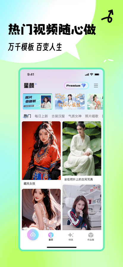 凭借强大的AI技术引擎,星颜带你体验各种AI视频图片特效,无需专业技术或复杂程序,只需一张照片,您就可以足不出户感受百变趣味特效。 产品特点: ⊙热门视频制作 通过先进的AI技术,上传一张照片,就可以制作视频,让你足不出户就能体验百样人生 ⊙自定义模板 找不到自己喜欢的模板?没关系,我们支持上传自己的视频,一键转换成模板,无论什么样的视频,都轻轻松松制作! ⊙百变发型 先进的AI发型设计技术,完美匹配脸型,只需一张您的照片,即可尽情换长发、短发、直发、卷发、刘海、换发色,更可根据脸型搭配最理想的发型款式,找出最适合你的完美发型! ⊙老照片高清修复 集图片AI上色、图片修复等一款多功能图片修复软件,包含图片黑白上色、图片修复、无损放大等功,实现老照片、模糊照片的画质增强精准修复 【订阅说明】 可以按照周、月、年等不同周期进行订阅,在VIP有效期内,可解锁会员专享特效视频图片制作。 用户确认购买并付款后计入iTunes账户,苹果iTunes账户会在到期前24小时内扣费,扣费成功后,顺延一个订阅周期 •订阅会自动续订,除非在当前期限结束前至少 24 小时关闭自动续订。您可以在手机“设置”> 进入“iTunes 与 App Store”>,并点击屏幕顶部的 Apple ID,来管理您的订阅。 隐私政策:https://pg.aa3.top/priv.html 用户协议:https://pg.aa3.top/agree.html 会员服务协议:https://pg.aa3.top/vip.html