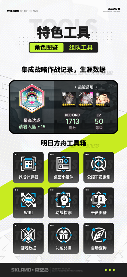 森空岛是鹰角网络官方社区,集合了鹰角网络旗下游戏、音乐、动画、周边、活动等官方资讯,同时也是玩家交流、互动、创作分享的平台。 -专属版区- 游戏版区:为鹰角网络旗下四款游戏《明日方舟》、《来自星尘》、《明日方舟:终末地》、《泡姆泡姆》,开放的专属版区。官方资讯,精彩二创、攻略考据,一网打尽。 开拓芯:森空岛为有意向入驻并同步发布内容的独立游戏提供相应资源,也为用户提供分享、讨论独立游戏的区域。 纳斯特港:森空岛不仅有游戏,也有生活。鼓励用户在该板块畅聊校园、生活、爱好等话题,结识更多同好。 -游戏工具- 账号绑定,角色名片,身份展示。 游戏成就,游戏数据,实时查询。 玩家wiki,游戏资料,随时获取。 攻略合集,大神作者,为你助力! -游戏福利- 每日签到即可领取合成玉、龙门币等游戏福利。 更有丰富活动,参与即有机会获得创作激励、实物周边、社区虚拟奖励等各类福利。 【关注我们】 官方网站:www.skland.com 微博:@森空岛 B站:@森空岛 【联系我们】 skland@hypergryph.com