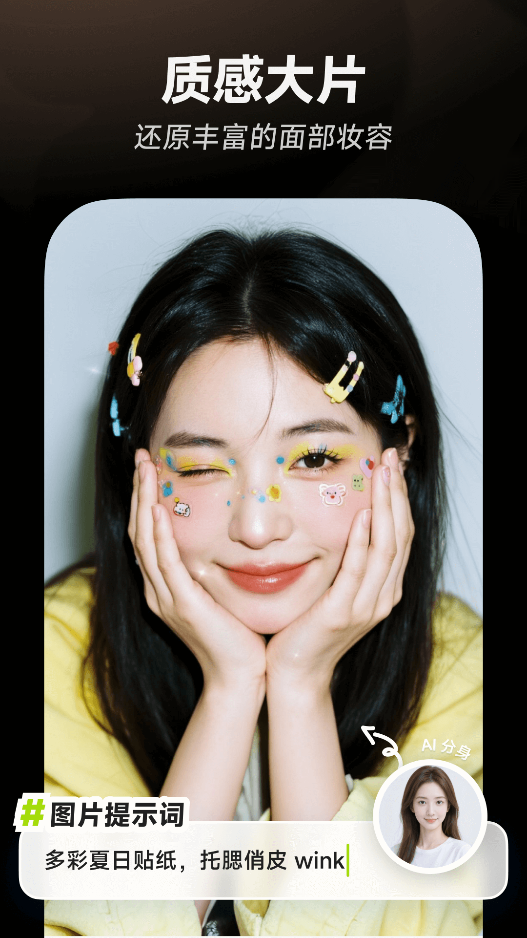 星绘是专注于 AI 人像的创作工具,提供丰富且低门槛的生图、生视频工具,满足用户的表达与创作。<br><br>【AI 分身】<br>上传你的照片,解锁高难度创意写真!<br><br>【质感大片】<br>精准还原面部妆容、表情、光影,超自然、超真实。<br><br>【传图做同款】<br>上传参考图,一键做同款。<br><br>【趣味变宝宝】<br>拍出独属于你的可爱表情包。<br><br>【AI 修图】<br>一句话 P 图,拯救废片。<br><br>【照片动起来】<br>精准响应指令,呈现灵动效果。<br><br>【视频换装】<br>动态还原服装细节。<br><br>【最美证件照】<br>零成本体验高级感证件照。<br><br>【AI 生图】<br>生成精美海报、壁纸、配图。<br><br>请注意,星绘提供AI生图功能,但人工智能存在局限性和不确定性。期待你的反馈和建议,我们将持续进步。