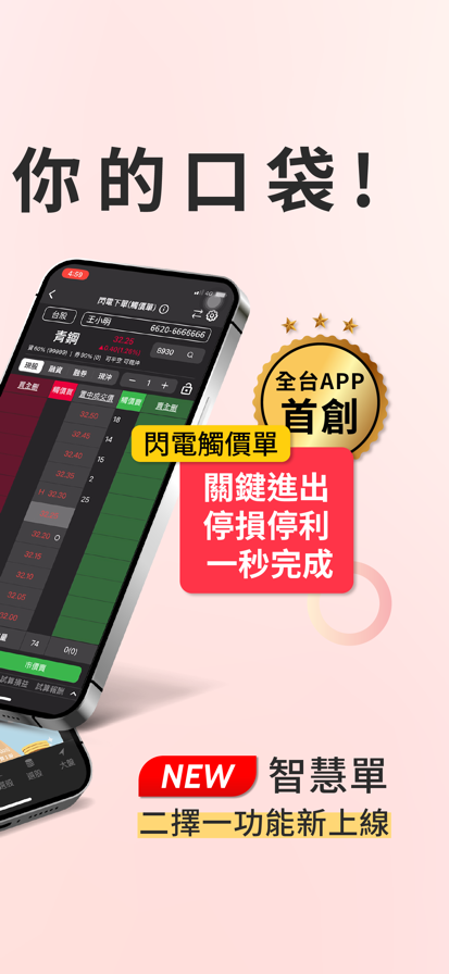 新手友善 × 高手好用的智慧證券 App 全台第一家純網路券商-口袋證券,比你還在乎你的口袋! 結合策略夥伴 CMoney 的 700 萬名投資理財大數據、超過50,000名的口袋用戶與 20 年以上的技術經驗, 打造一個 簡單好上手、功能強大不複雜 的新世代證券 App。不論你是剛起步的新手、還是追求效率的高手,口袋證券都能滿足你。 ● 安心保障 × 金管會認證 × 獲獎肯定 政府認證合法券商|114年金管證總字第0034號 榮獲多項市場肯定 112、113年度榮獲「開戶成長率」與「市占率成長」市場第一名 112年度 榮獲「國家品牌玉山獎-最佳產品類」 112年度 榮獲「ETF交易進步獎-第一名」 113年度 榮獲「反詐騙評鑑活動-傑出獎」 114年度 榮獲「創新版上市宣導-進步獎」 ● 極速開戶 × 一站式下單 5 分鐘即可完成開戶,即時線上審核,當天就能交易 支援 31 家銀行交割、27 家自動扣款,一鍵串接,資金調度超便利 台股、美股 App 分開設計,操作清晰,新手不怕搞混 看盤、選股、下單,口袋台股一站完成,省時又高效 ● 新手專屬 × 輕鬆入門投資 投資教學專區 : 每日60秒《口袋日報》,幫你快速掌握市場重點,從零開始也不怕 口袋存股輕鬆存 : 定額定股自動買,買進價格自由訂,累積資產真簡單 智慧選股找飆股 : 超過 50 項籌碼、技術、基本、價量等篩選條件,輕鬆建立你的投資邏輯 ● 高手進化 × 快狠準的操作節奏 AI判多空 × 籌碼動向:洞悉轉折,掌握進出場節奏 閃電觸價、多種智慧單類型 : 進出場不卡手,策略更靈活 掌握關鍵分點:獨家揭露高手、重要券商選股標的,隨時掌握分點進出關鍵 現在就下載口袋證券 App 從選股到下單、從學習到進場,一支手機就搞定你的投資未來! 立即開戶:https://pse.is/5kltph 口袋官網:https://www.pocket.tw/ ①客服信箱:mailbox@pocket.tw ②客服電話:週一至週五08:00〜17:00,請撥打 (國內客戶) 0809-089-001 (國外客戶) 886-2-7753-2508 ※ 為確保您的帳務安全,請於行動裝置安裝防護軟體。 ※ 免責聲明 本系統由口袋證券開發,依法擁有其智慧財產權,任何人不得擅自使用、修改、重製、公開播送、改作、散布、發行、公開發表、進行還原工程、解編或反向組譯。本服務資訊僅供參考,使用者依本資訊交易發生交易損失需自行負責,本公司對於資訊內容錯誤、更新延誤或傳輸中斷不負任何法律責任。 口袋證券網站及各交易管道所提供之即時報價或盤後分析資料等,係由第三方資訊服務者提供,僅供委託人參考,口袋證券不保證其即時性、正確性或完整性,委託人仍應依自己之判斷委託買賣,不得對口袋證券主張任何權益。任何資訊內容之提供者因軟、硬體設備之瑕疵、故障、不可抗力或人為操作上之疏失,導致資訊傳輸之遺漏、錯誤、遲延、障礙或中斷等異常情事,口袋證券不負任何法律責任。