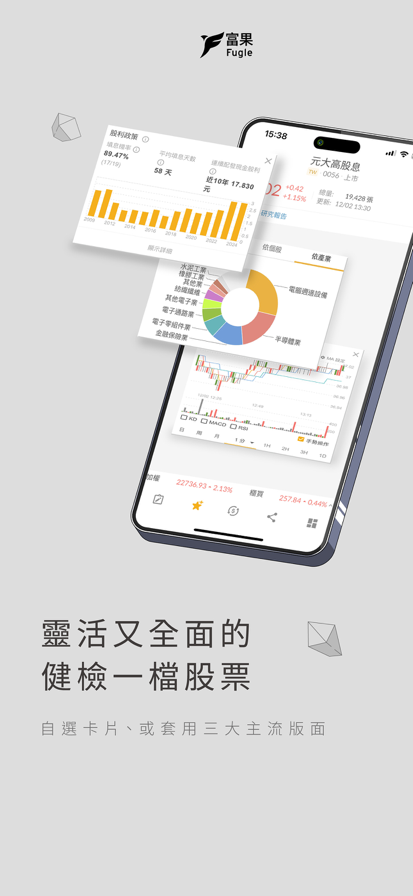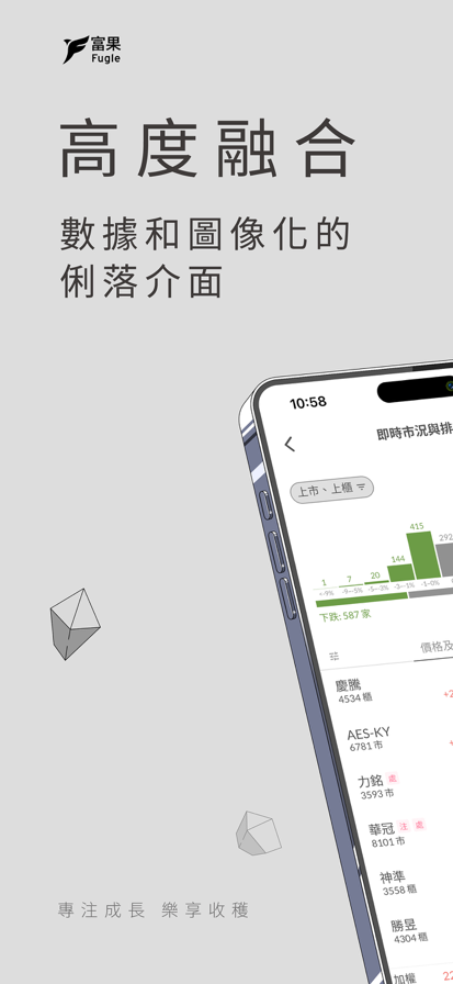 專為年輕人打造的個人化投資研究平台,告別複雜難懂的介面,富果專為年輕人打造的個人化投資研究平台為你帶來 高度視覺化 的指標資訊,讓新手也能快速上手!富果團隊的每一天,都持續提升使用者體驗,透過好看好用的服務,幫助投資人自信投資,樂享收穫。 【富果核心優勢】 - 專屬客製化介面: 任選卡片自由拼貼,打造你的 專屬股票研究版面。不論是基本面、消息面、還是 籌碼面,所有資訊一手掌握,省下大量研究時間。 - 富果直送: 人人都看得懂的 白話產業研究報告。主題涵蓋 半導體、傳產、投資觀念 等,讓研究事半功倍! - 跨裝置流暢體驗: 支援手機、平板、桌機網頁同步操作,iPhone/iPad/Mac 隨心轉換,隨時掌握 股市行情。 【功能特色】 - 選股工具: 輕鬆掌握市場脈動,快速找到 投資 好標的。 - 清晰看盤: 簡單直覺的介面,即時掌握 股票、ETF 股價與大盤走勢。 - 精準線上客服: 文字客服 Kate & Amy,為您精準解答投資規則、介面操作等問題。 立即下載 富果 Fugle,體驗最好看、最好用的 台股 投資 App!