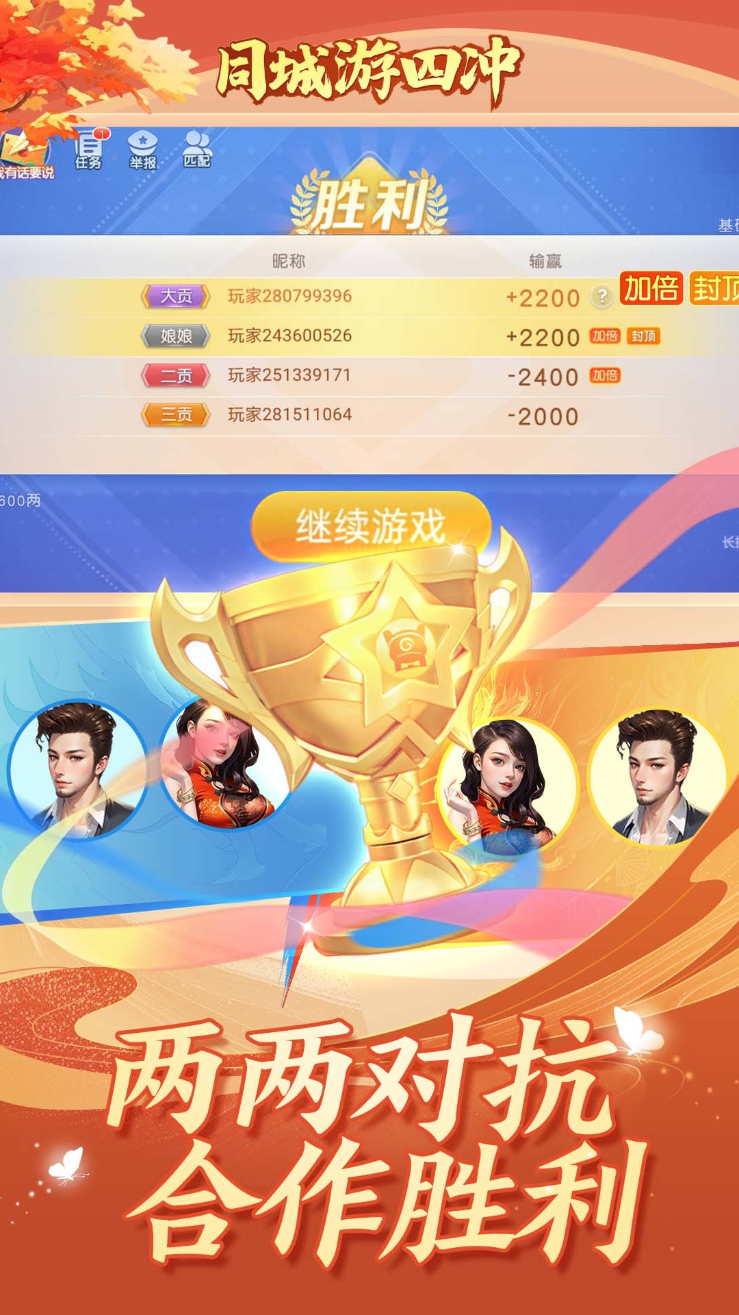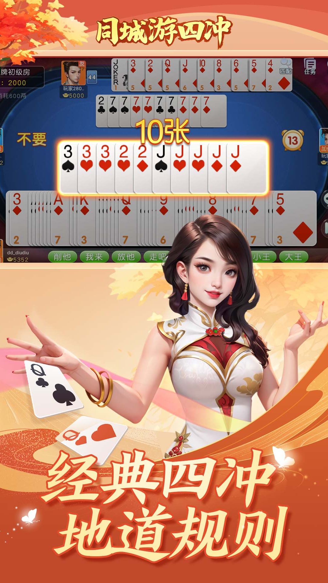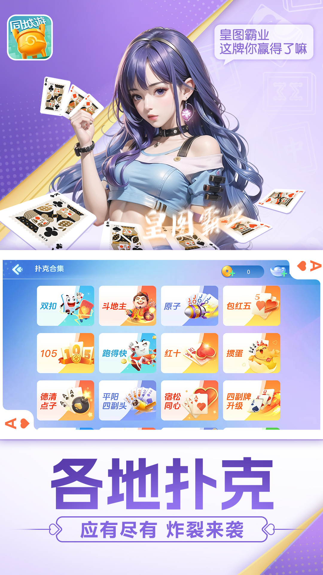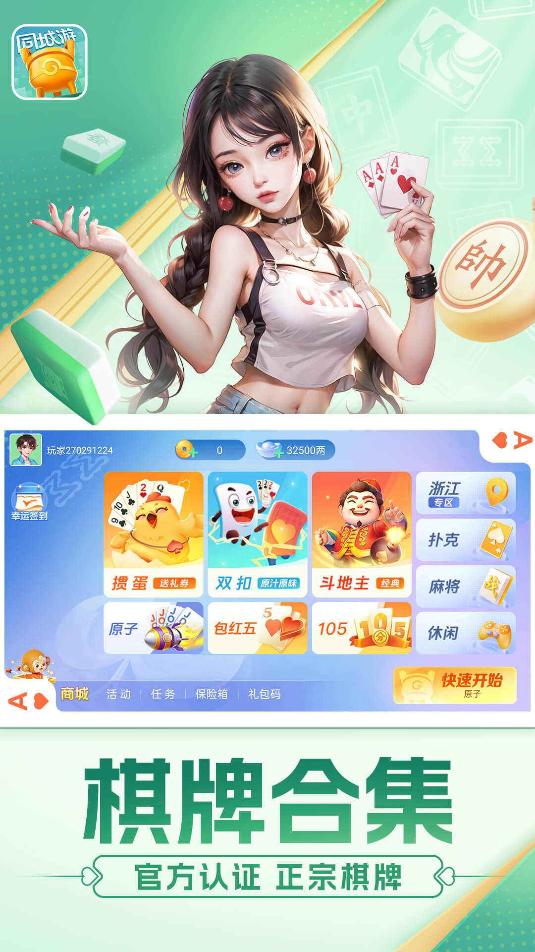 同城游:约牌是一款覆盖全国大部分地方线下棋牌玩法的线上玩法大全,经过当地多次线下实地走访调研,搬运游戏规则至手机上,让每位不在家乡的游子也能时常感受来自家乡亲人的特殊关怀! 内置所有游戏终身免费下载体验,当前已经覆盖浙江、安徽、江苏、山东等省份的扑克麻将玩法。 游戏已支持一键地区切换快速找到家乡地道的线上游戏,自由选择切换,多样玩法不无聊,还能与全国高手切磋牌技,更有各类比赛动动手指大奖轻松拿回家。 游戏特色 【原汁原味,画面精美】 地方游戏玩法,原汁原味当地特色,梅兰菊竹、春夏秋冬,精美画面,舒适不伤眼睛! 【万人在线,一秒配桌】 数万玩家实时在线,极速配桌,对局无需等!好友相邀,距离不是问题! 【每日签到,福利多多】 每日签到抽奖、摇奖抽奖,获取免费银子,嗨玩全场,福利享不停! 【比赛不停,奖励丰盛】 各类比赛免费报名,同场竞技争冠军,人人有奖不落后。 1、免费下载,占用空间小,耗电小,优化消耗,优先检测Wifi; 2、防作弊,无外挂,提供公平公正的游戏环境,安心玩游戏; 3、真人竞技,多人在线,无需等待,对局秒开,渡过闲暇时间的良好选择; 4、还原地方特色玩法,家乡伙伴一起玩。组队抓分乐趣多,闹闹财神双还原,宝牌加分乐趣多。