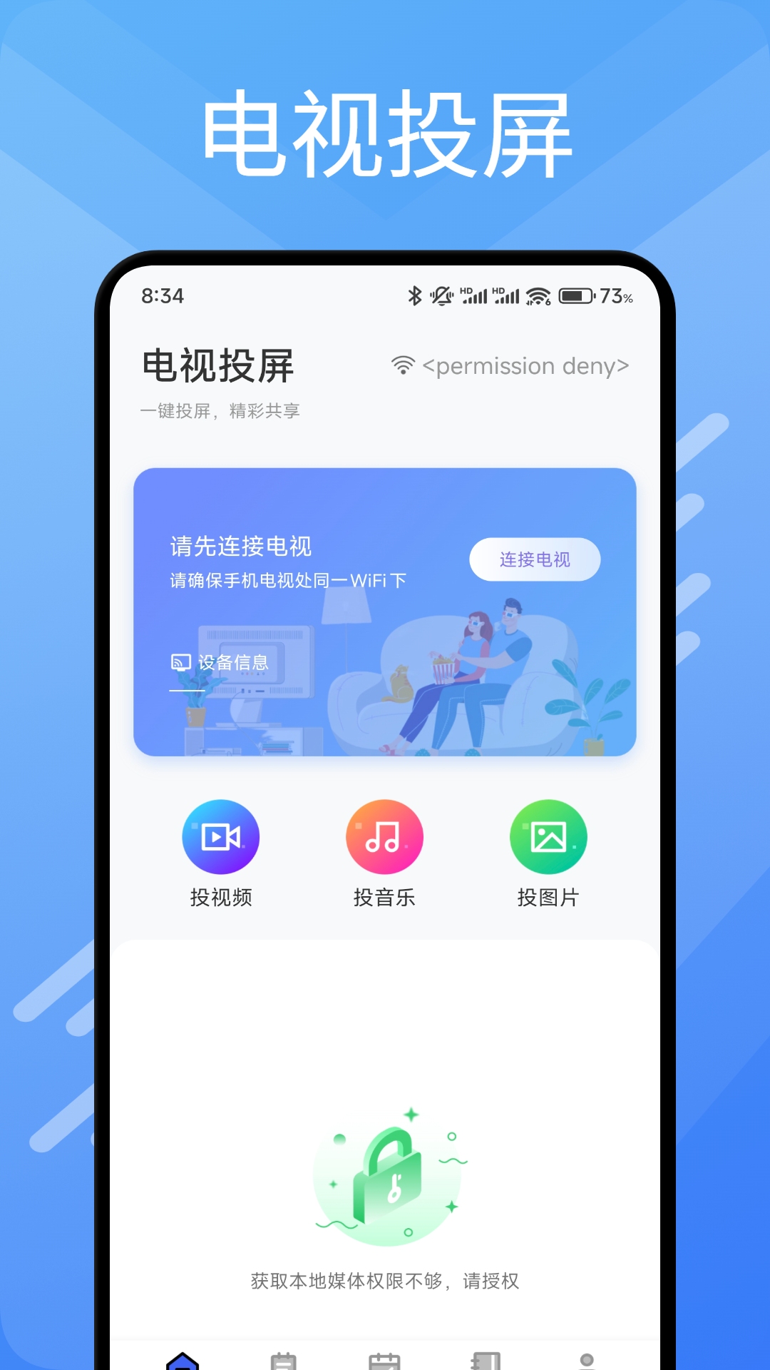 -手机屏幕小,拿手机累? 让我帮您,同网络极速投屏,一键即可畅享大屏,解放双手! 同时支持将您手机里的视频影视,音频,照片等投放到同网的电视设备!