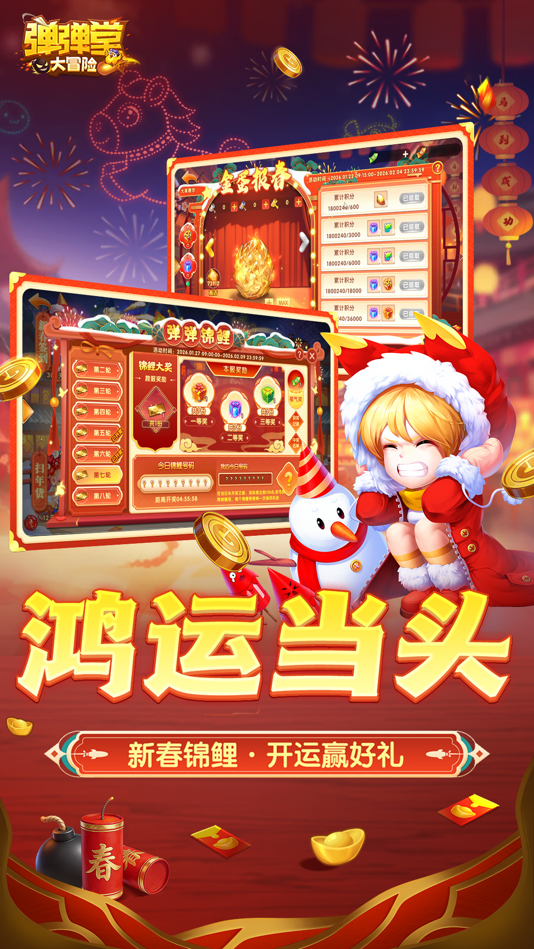 全新系统玩法、春节主题主城与外观内容重磅登场,多项节日活动同步开启,为玩家带来更丰富、更热闹的新春冒险体验。<br><br>【全新系统:圣核系统】<br><br>新增核心养成系统——圣核系统。<br>玩家可通过祭祀多种材料获取圣核。<br>每个圣核自带1–4个随机技能,技能组合存在多种可能。<br>两个圣核可进行融合,生成一个全新的圣核。<br>新圣核的技能数量,将在两个参与融合圣核的数值总量区间内随机生成。<br><br>圣核系统为角色成长提供更多策略空间,打造更具差异化的战斗体验。<br><br>【新春主题内容全面登场】<br>新春主城<br>春节限定主城正式开放,整体场景焕新,新年氛围拉满。<br><br>新武器:249与凤行<br>新时装:国潮千金、财神少爷<br>新翅膀:凤鸣九天<br><br>整体设计围绕新春氛围打造,让角色在节日期间焕然一新,过年也要有过年的样!<br><br>【新春系列活动开启】<br>春节期间,多项节日活动持续开放。<br><br>完成日常挑战、参与节日玩法,即可获得春节专属奖励。活动节奏覆盖整个假期,不必赶进度,也能持续参与,轻松积累资源,在假期里随时上线都有收获。<br><br>其中丰厚奖励更是包含:<br><br>《弹弹堂大冒险》限量版定制金钞,等待新年锦鲤们带走~<br><br><br>【马年神宠登场:双子天马】<br><br>全新神宠“双子天马”上线。<br>战斗中可自由切换日、月双形态,具备加血、解控、伤害强化等多种能力,攻守兼备,可适配多种战斗场景,成为新春版本的重要战力伙伴。