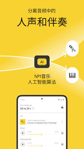 LALAL.AI:用AI魔术改变你的音频!<br><br>轻松地从任何歌曲中去除人声或乐器,创建高质量的器乐曲目,并隔离特定元素进行混音、节录乐曲等。先进的人工智能算法确保了卓越的分割精度和音频质量,使LALAL.AI成为专业人士和爱好者的首选工具。<br><br>主要功能:<br>- 人声和乐器提取:同时分离任何歌曲和视频的人声和伴奏。<br>乐器隔离:提取鼓,低音,钢琴,原声吉他,电吉他,合成器,弦乐和管乐器。<br>- 噪音消除:通过减少背景噪音、人声塞音、麦克风隆隆声和其他无关声音来清理录音。<br>- 音频和视频支持:导入MP3、OGG、WAV、FLAC、AVI、MP4、MKV、AIFF和AAC格式的文件。<br>- 无需转换:以与原始文件相同的格式提取音轨并清理轨迹。<br>- 批量上传和处理:一次上传最多20个文件,以节省您的时间。<br><br>利用LALAL.AI释放您的创作潜力,将您的音频项目推向新的高度!<br><br>如何使用<br>1. 点击“选择文件”上传您的音频或视频。<br>2. 选择要提取或移除的音轨。<br>3. 听音轨预览。<br>4. 获取完整的音轨。<br><br>免责声明<br>我们强烈建议您不要上传包含第三方知识产权的内容(如受版权保护的材料),除非您获得该方的许可。用户对上传到应用程序的内容负有法律责任。<br><br>隐私政策:https://lalal.ai/privacy-policy<br>条款和条件:https://lalal.ai/terms-and-conditions