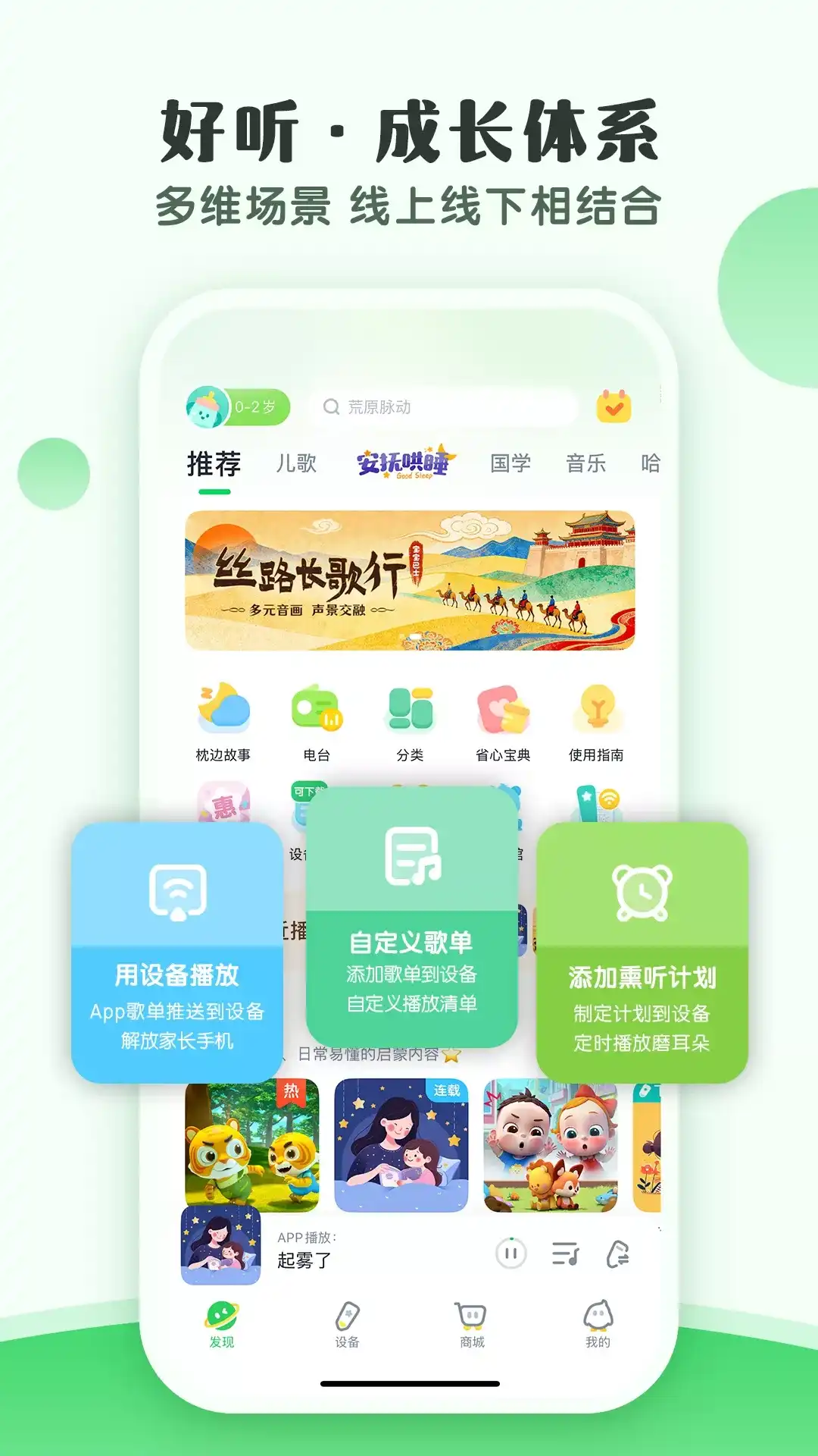 【小布咕】 抓住语言关键期,培养孩子流利表达 由宝宝巴士官方出品,用哄睡安抚、经典音乐等优质音频,配合智能硬件,全场景满足亲子家庭的声音需求。 【“好听”成长体系】 遵循儿童语言发展规律,为儿童提供合适的音频内容。让孩子在丰富词汇的自然语言环境中,掌握知识,流利表达。 1、语言认知关键期 培养的重点在于“丰富听觉世界,奠定语言基础” 以音乐和童谣为主,选编「律动音乐」「亲子哄睡」「语言启蒙」3大主题,用富有音律的旋律,带儿童认知简单事物。 2、语言表达爆发期 培养的重点在于“培养生活习惯与社交礼仪” 以儿歌和故事为主,选编「国学诗词」「生活认知」「习惯养成」「安全意识」4大主题,拓展儿童的表达能力。 3、语言社交表达期 培养的重点在于“促进思维发展,提高社交能力” 以故事和小知识为主,选编「安全剧场」「爆笑语文」「科学探索」3大主题,锻炼儿童的逻辑思维能力。 【优质的音频启蒙内容】 ·听音乐,发展儿童听觉,增强音乐兴趣 ·听儿歌,认知日常事物,培养生活习惯 ·记忆听,诵读古诗,韵律记忆,增强孩子的记忆力 ·听故事,增强逻辑思维,培养社交能力 ·听小知识,记忆和积累知识点,拓宽认知 ·听解说,增强语言理解,感受音乐之美 【账户删除功能说明】 删除账户路径:我的-设备-注销账号; 账号注销后,账户及账户下的所有个人数据都将删除。 宝宝巴士(BabyBus)是专注打造儿童启蒙数字产品的原创品牌,累计服务全球7亿家庭用户。宝宝巴士秉承“快乐启蒙”的理念,用奇妙有趣的方式,为儿童量身定制以“好听(国学故事)、好看(儿歌动画)、好玩(互动APP)”为特征的海量数字启蒙内容,让孩子趣味认知、感受“真、善、美”。 欢迎联系 微博:@宝宝巴士 官网:https://app.babybus.com 邮箱:cn@babybus.com 在宝宝巴士,我们自己也身为父母,所以非常重视儿童的健康和隐私。下载应用前,您可以从这里阅读我们的隐私政策:https://udb.babybus.com/AccountH5/ProductPrivacy?productid=3302&verid=1000000&chcode=1