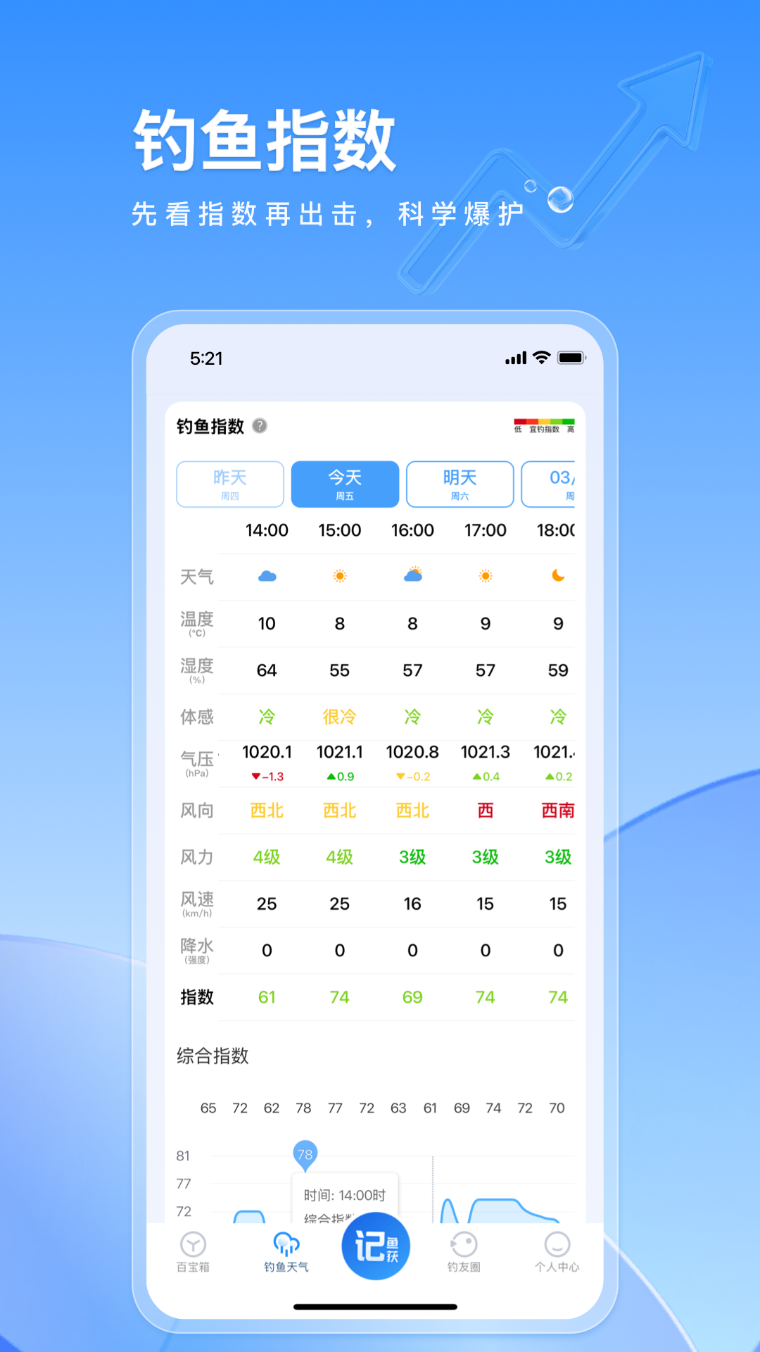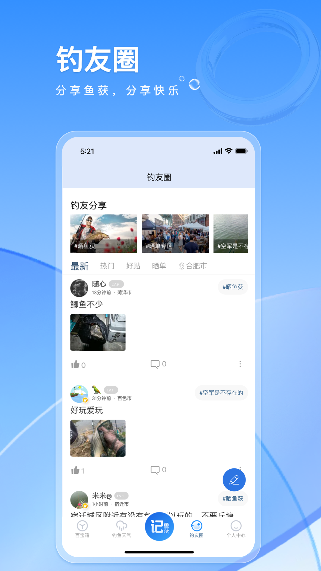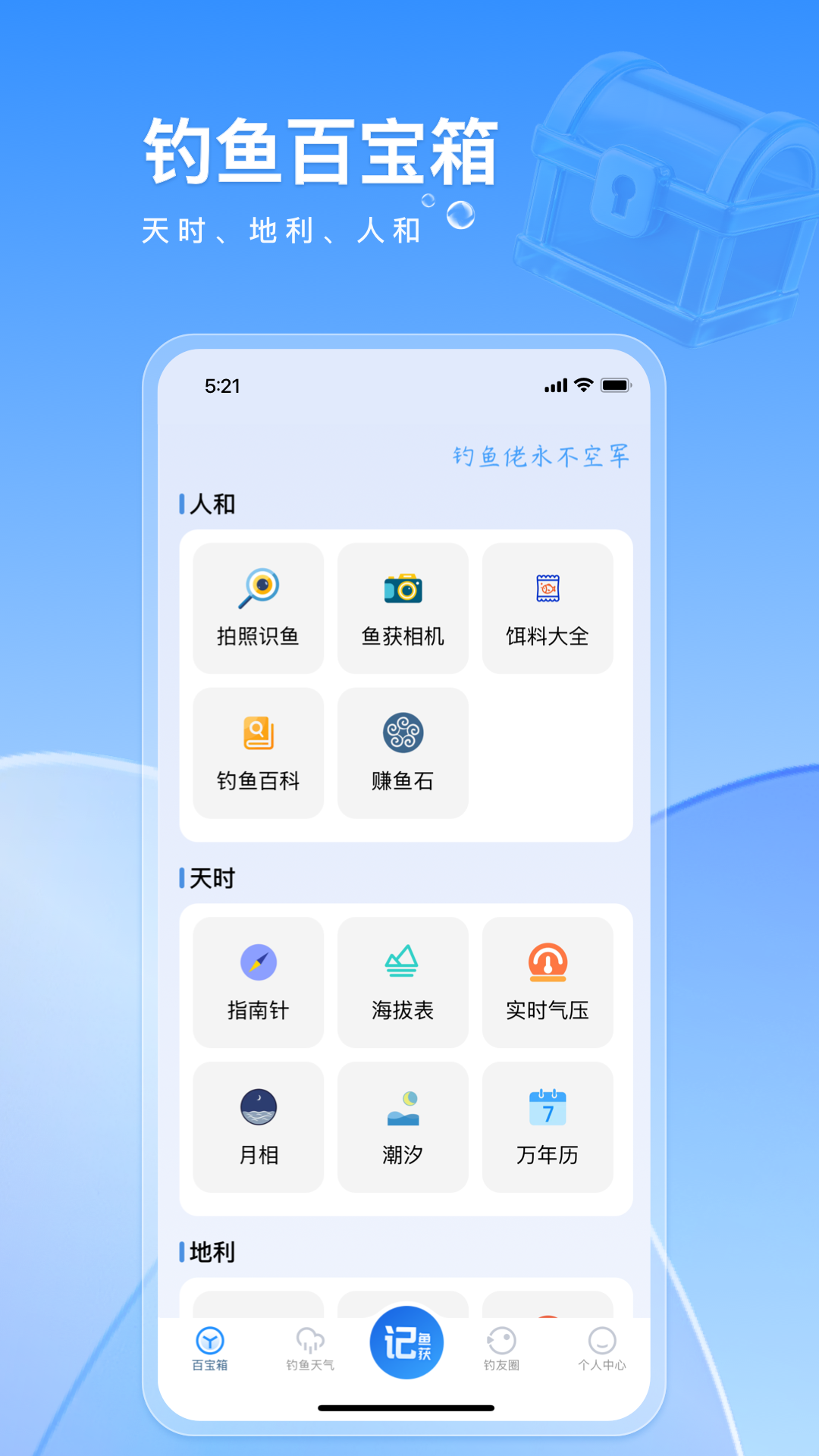 实用简洁、功能齐全的钓鱼爆护百宝箱APP「钓鱼佬」现已上线。<br><br>钓鱼天气/钓鱼指数功能是基于钓点位置的钓鱼天气查询工具,可定位到钓位!综合了钓点的天气、温度、气压、湿度、风速、风向、降水、月相等10+项鱼儿活跃相关因素经过智能算法输出的逐小时、逐天(24小时X14天)钓鱼指数,参照钓鱼指数可以让您更加简单的成为钓鱼高手,次次爆护。<br><br>百宝箱<br>天时:指南针、海拔表、实时气压、月相、潮汐查询、卫星地图 <br>出门野钓掌握各种户外活动所需数据,实时气压监控气压实际变化,全国300+潮汐观测点,一键查询潮况,何时涨落潮、潮水流速一目了然,矶钓海钓赶海好帮手,祝您出行愉快!<br><br>地利:钓点探秘、钓场查询、全国江河水位、渔具店查询 <br>查钓点、分享自留地赚取鱼石,查询江河水位变化,查看周边渔具店。<br><br>人和:钓鱼百科、拍照识鱼、鱼获相机、饵料大全<br>查百科学知识提升钓技,遇到不认识的鱼拍照即可识别,鱼获相机祝您分享爆护荣耀时刻,不知道用什么饵料,简单搜索获得推荐。<br><br>钓鱼佬永不空军!