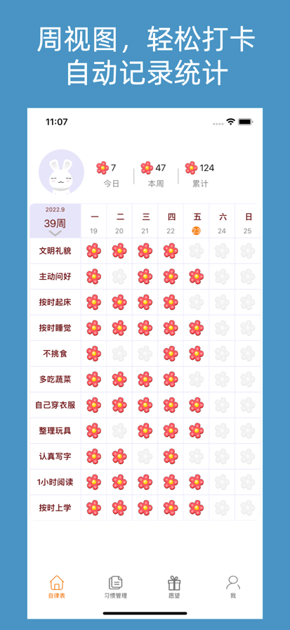 儿童成长自律表是一款专为家长设计的智能工具,帮助您轻松引导孩子建立良好生活与学习习惯,对比线下使用的“儿童成长自律表”更为智能和方便,可告别繁琐的纸质表格! 通过趣味打卡、即时小红花奖励和愿望兑换相结合的方式,让习惯培养变得有趣又有效: 【轻松打卡】完成每日小任务,一键打卡,习惯养成不费力。 【智能统计】小红花自动记录与累计,数据清晰一目了然,比纸质表格省心百倍。 【个性管理】预设丰富常用习惯,更能自由添加专属任务,灵活匹配孩子成长需求。 【目标激励】设定愿望目标,孩子随时查看小红花进度,兑换心仪奖励,动力满满! 【透明记录】小红花收支、愿望兑换历史全程可查,成长点滴尽在掌握。 助力解决家庭育儿核心痛点,让孩子在趣味中主动养成好习惯,让您的育儿过程更轻松、更智能! • 作业总拖拉到深夜? → 规律学习打卡,培养时间观念! • 挑食不肯吃蔬菜? → 健康习惯挑战,轻松引导不挑食! • 沉迷电子产品? → 用小红花兑换“屏幕时间”,建立健康使用规则!