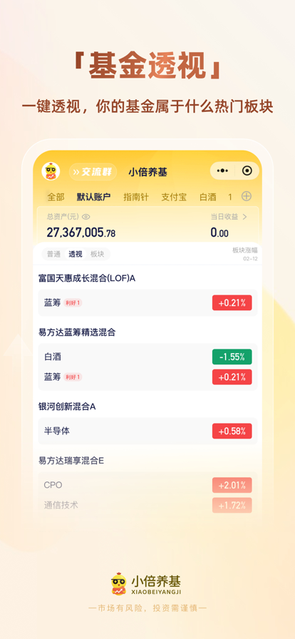 小倍养基是一款简洁高效的AI养基神器。 ① 如果你在多个平台购买了基金,可通过截图识别汇总到小倍养基统一管理。 ② 提供账户诊断、持仓分析、收益分析、基金诊断,时刻为你的账户护航。 ③ 提供各维度的基金榜单和行业榜单,让你掌握市场趋势。 ④ 提供智能定投、基金扫雷、指数估值、股债利差等10几项辅助工具。 ⑤ 真实的基民社区,每天和百万基民一起聊行情,学投资。 【自动续费会员】 --月度会员权益:波段信号、会员内参、特殊标识、社区权限等 -- 订阅周期:3个月(小倍会员连续包季产品),12个月(小倍会员连续包年产品) -- 订阅价格:以IAP申请信息为准,例如连续包月产品价格为每季129元;连续包年产品每年399元 -- 付款:用户确认购买并付款后计入iTunes账户。 -- 取消续订:如需取消续订,请在当前订阅周期到期前24小时以前,手动在iTunes/Apple ID设置管理中关闭自动续订功能。 -- 续订:苹果iTunes账户会在到期前24小时内扣费,扣费成功后订阅周期顺延一个订阅周期。 -- 隐私政策:https://help.betasmart.tech:8443/pages/privacy/ -- 用户协议:https://help.betasmart.tech:8443/pages/legal/