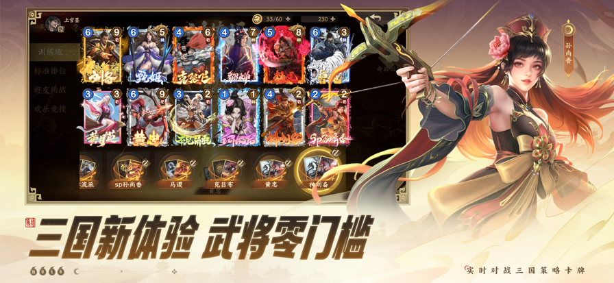 【快节奏对战】 3分钟,拿下!使用你的卡牌,在战场上进行1v1、2V2的战斗,快速决策,获得更多分数以达成胜利! 【自由构筑百变卡组】 你可以快捷地使用官方推荐的卡组上分,也可以在上百张卡牌中构筑只属于你的卡组。不要忘记当你获得连续胜利后,把自己的获胜心得快速分享给更多的人哟! 【多维战场策略】 没有废牌,只有奇招!在夺帅,充分利用战场效果、奇兵锦囊和押注机制可以在关键时刻助你制胜一击、反败为胜!出击与防守、获得与舍弃……多维战场策略每一局的战场体验都非同一般! 【三国题材绝美国风】 这里有高历史还原度的武将立绘,有水墨、山海等多精美主题国风皮肤,更有至臻高级动态皮肤带你体验武将热血出击的畅快和美人顾盼生辉的绮丽。对局中,多主题棋盘带你穿梭四时风物、领略大好河山,小小神将决胜一击,演绎华丽战场特效!快来,与历史名将、文臣君主、红颜巾帼、萌物神兽并肩作战,闯荡天下! 【新人友好福利拉满】 新手7天乐,每天领强力武将!完成7日成长任务,领取翻盘奇将太史慈!连续5天,每日送50抽,助力快速组建入门卡组!强势流派抢先试玩,试玩卡组四选一全套带走!更有海量卡组攻略,一键复制高手套路!