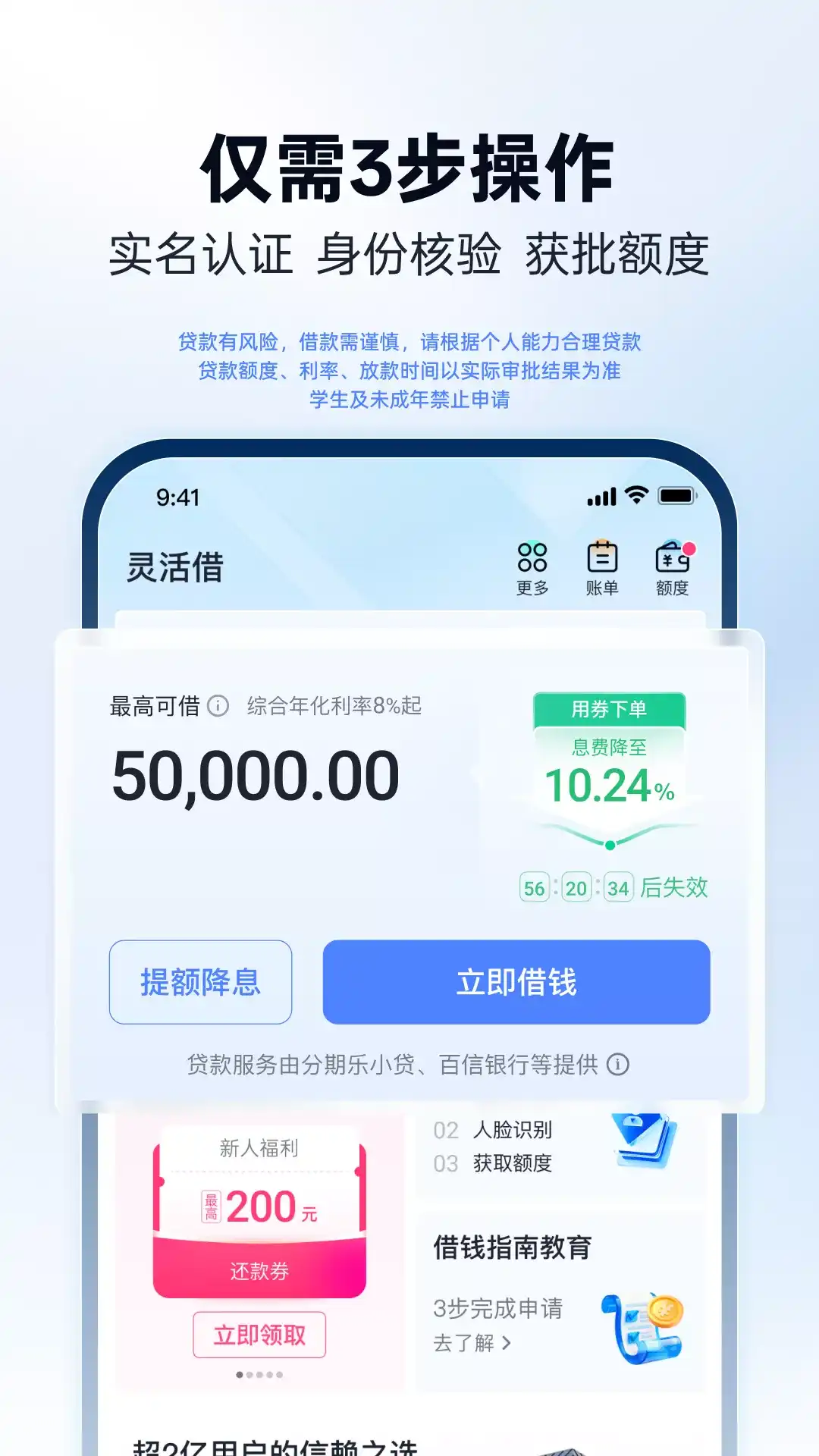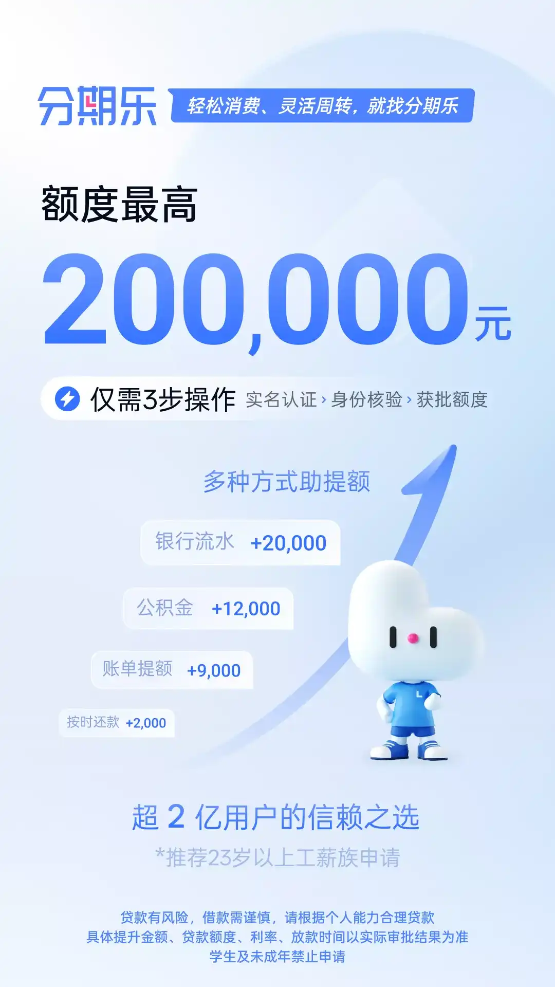 【平台介绍】 分期乐是乐信旗下倡导年轻人有度消费的分期消费平台,以更懂年轻人、更有安全保障、更有温度的产品体验和金融科技服务,让年轻人可以享受安全、稳定、便捷的现金借钱、分期购物和分期还款的金融服务,已有超过1.5亿用户选择分期乐。 【产品优势】 纳斯达克上市公司(股票代码:LX)旗下品质分期购物商城和分期借贷金融平台; 贷款资金由正规金融持牌放款机构提供,百行征信合作机构; 利用AI技术和大数据风控技术给用户提供安全靠谱的分期借贷平台; 息费透明,期数灵活的分期借款平台; 是超过1.5亿用户值得信赖的借钱平台。 【主要特色】 安心借款:费用透明,借钱更放心; 安全保障:银行级风控团队为您的账户安全保驾护航; 优质体验:支持线上贷款申请,方便快捷,借钱分期期限灵活; 分期购物:国行正品,品质保证,分期还款更便捷。 【贷款利率说明】 年化利率区间8-24%,因个人资质不同,最终以平台实际审批为准 以上应用截图仅为示例,贷款额度、利率、放款时间、通过率等以实际审批为准 贷款投资有风险,借款需谨慎;请根据个人能力合理贷款,理性消费,避免逾期。