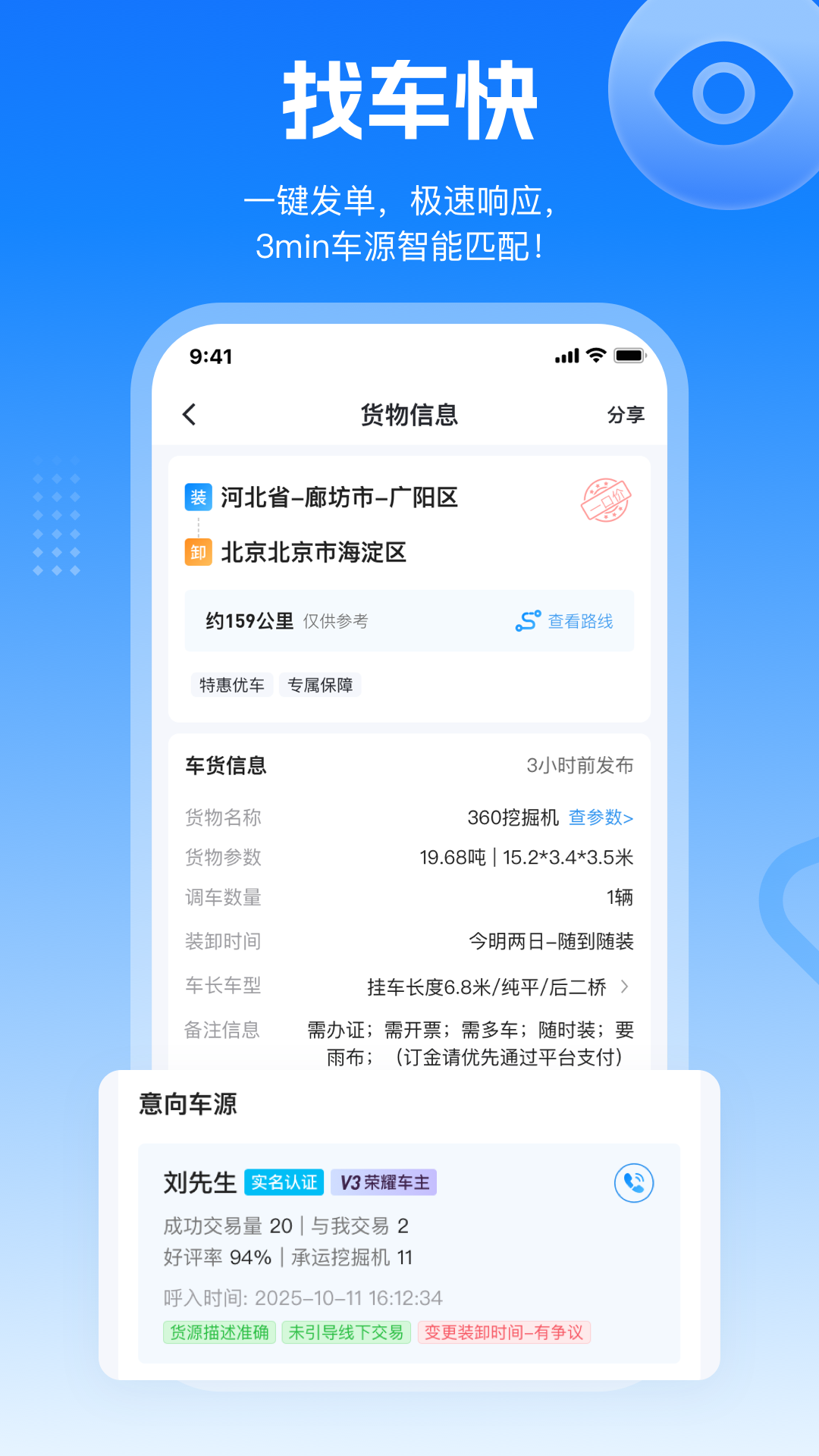 特运通货主是特运通旗下专注大件运输的专业平台,为全国用户提供安全高效的大件发货找车服务。特运通整合360+城市资源,汇聚350万+实名司机,覆盖各类大件运输场景,支持一键匹配低平板、爬梯板等专业车辆。依托特运通品牌强大的大件运输网络,让您的大件货物运输更快捷、更省心!同时特运通车主APP端可一键接货,快速响应主需求,构建全国范围的大件运输服务生态。发货就送特运通货运,专业、可靠赖的大件运输平台 一、车源丰富,价格透明 特运通汇聚350万+实名司机,一手车源直连,价格划算更省心 二、车型齐全,专业大件 涵盖低平板、爬梯板、液压板、后三桥、平板车、清障车、凹槽板等各类专业大件专业运输车辆全覆盖,轻松匹配大件设备运输需求 三、大件货类,专业承运 专注工程机械、风电设备、化工设备、大件设备,例:挖掘机、高空作业车、打桩机、装载机、铲车、自卸车、起重机、压路机、推土机、收割机等,均可专业车辆匹配,安全可靠 四、线路密集,直达全国 覆盖北京、上海、深圳、广州、天津、武汉、济南、青岛、宁波、苏州、杭州、南京、福州、厦门、佛山、东莞、惠州、中山、长沙、成都、重庆、西安、沈阳、郑州、珠海、合肥、嘉兴、南宁、昆明、金华、石家庄、太原、温州、保定等360+城市,10万+线路一键发车 五、服务保障,省心高效 专属客服跟进,电子发票便捷开票,运输全程可控,安全放心 【联系我们】 全国客服热线:400-6688-998 APP内留言:特运通货主“我的”-“投诉与建议”随时反馈