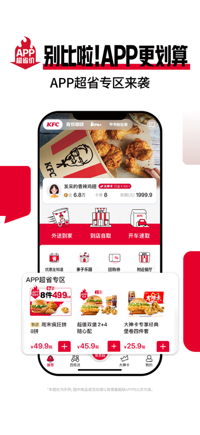 【肯德基超级APP】 丰富体验,WOW会员逛吃更尽兴! 划重点教你玩转6.22.0! 【发现优惠】 - 肯德基大神卡:开卡享正餐、咖啡、早餐、下午茶、满额免外送费,五大权益,全天随时省! - 疯狂星期四:每周四多款美味等你来,干饭人狂喜! - 周末疯狂拼:周末到店享8件49.9元! - 新人大礼包:新人首次注册或登录WOW会员享新人大礼包! 【贴心服务】 - 手机自助点餐:随时随地点餐不排队,动动手指选美味! - 宅急送外卖订餐:想吃什么点什么,风雨无阻送上门! - 早餐管家:24小时可随时预约早餐,提前约好更安心! 【我的福利】 - 积分兑好礼:边吃美味边赚积分,兑换好礼惊艳众人! - V金商城:品牌周边、限量礼物、专享优惠券都可以用V金换哦! - 会员特权:肯德基会员超有福,常来「卡包」有惊喜~ - 充值:充余额有福利,超值赠券等你get~ 【我要好玩】 - 亲子乐园:来肯德基过生日吧!多款主题可选,好玩又好吃,还有惊喜生日礼送! - K-Music:点播喜欢的歌曲做背景音乐! 【我有异议】 在使用过程中如果遇到任何问题,欢迎联系我们,程序员小姐姐,客服小哥哥们坐等你来撩: - 肯德基官方微信:kfczhongguo - 肯德基宅急送官方微信:KFC_Delivery - 官方微博:肯德基 - 客服热线:4008-823-823