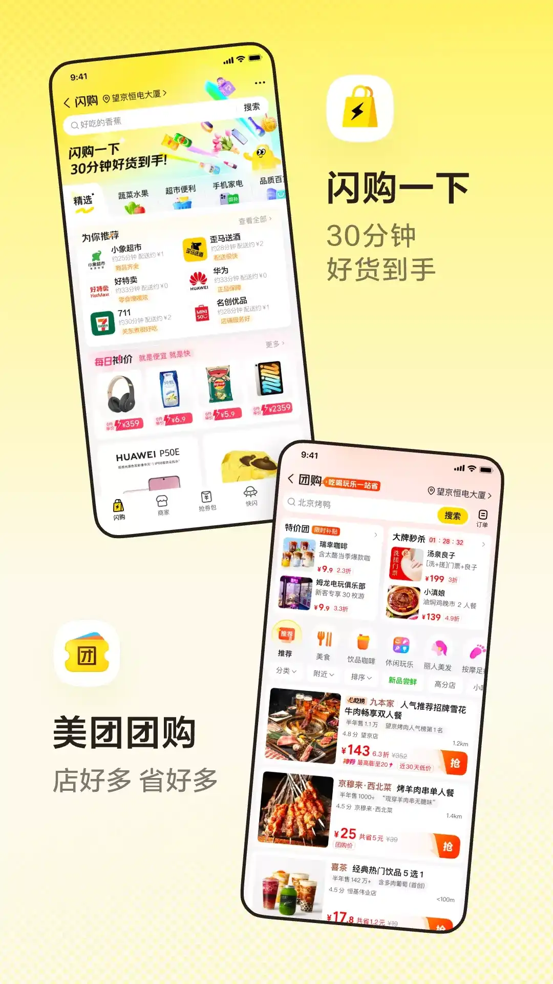美团外卖,专业的美食外卖订餐平台! 【产品特色】 美团外卖为您提供各类品牌外卖,美食商家订餐服务。套餐优惠,支付满减,下单抢红包优惠更多! 不出门不下厨房即可享受各地区特色美食外卖,天天都是美食节!上美团拼好饭选择极具性价比的外卖,0配送费,无起送价。无需用券就能畅吃大牌,实惠外卖十分满足! 超多品牌外卖如必胜客,肯德基,必胜客宅急送,私房菜等多种美食送餐上门~附近美食,超市百货,生鲜,中餐、西餐、蛋糕店、美食小吃、快餐、火锅、川菜、蛋糕、烤肉、美食饮料甜点,外卖订餐更方便,不用出门直接叫外卖订餐吃饭。 寒冷、雪天、宵夜不想出门?动动手指,即可下单,最快30分钟可享用美食。还在等什么,饿了马上下载美团外卖app,享受优质的美食外卖订餐服务。 【新人福利】 新用户最高可领60元大额红包 【功能介绍】 附近美食,全国各地特色美食 全新支持,超市百货生鲜下单 简单订餐,手机下单快速方便 品质外卖,品牌餐厅安全放心 在线支付,在线支付优惠更多