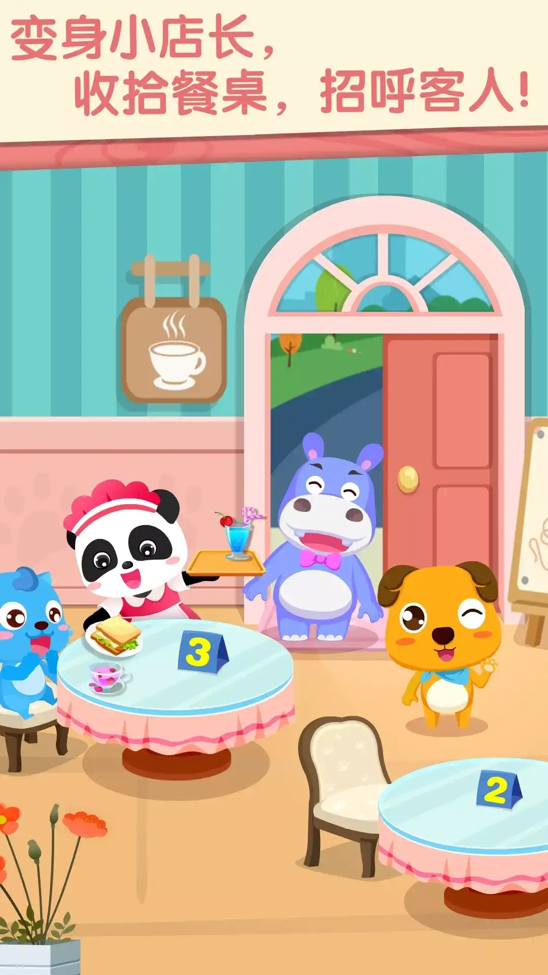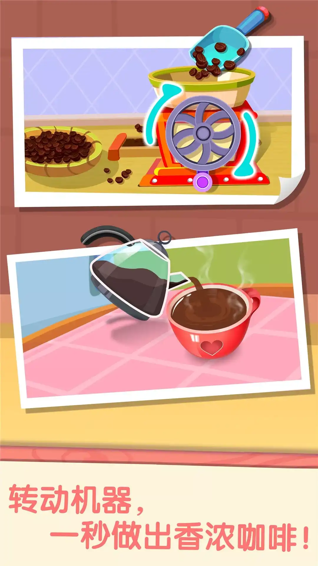 【奇妙咖啡餐厅】的一天开始啦!小店长,请开始你的工作! 从为客人点单,到烘焙甜品,再到收拾桌子,招呼新客人,由你全部搞定! 动手制作美食,提升操作能力;用心服务每一位顾客,体验经营的乐趣! 产品内容 【忙碌的一天,从点单开始】 冰淇淋、披萨、饮料、蛋糕、甜甜圈……经典甜品菜单,快翻开看看! 【转动机器,烘焙甜品】 咖啡机、面包机、搅拌机、榨汁机、糖果机……多种机器等你来体验! 【DIY制作,打造特色美食】 三明治里放蔬菜还是培根?做心形饼干还是小熊饼干?多种口味造型,任你DIY! 【打扫餐桌,保持干净】 收拾剩余餐具,把桌子擦干净……多亏了你,餐厅越来越干净! 【招呼顾客,让顾客满意】 又来了一大波客人,赶紧安排座位,别让他们等太久了! 【赚取金币,获得奖励】 用厨艺赚取金币,就能解锁更多道具,烘焙更多甜品!