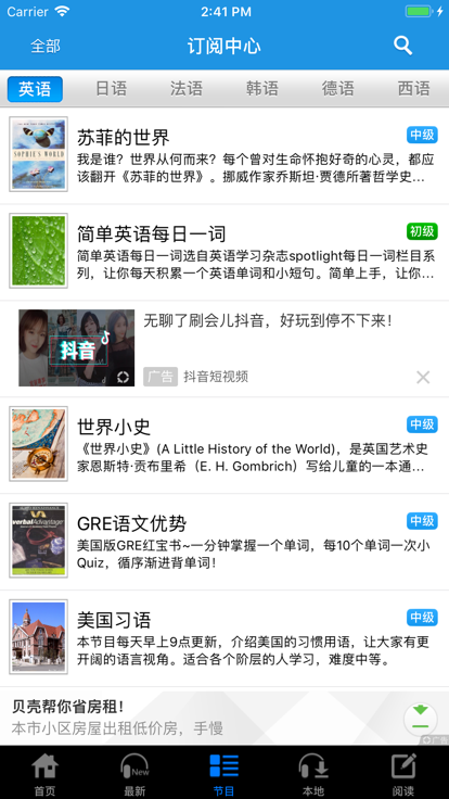 覆盖全阶段英语学习资料,囊括美国之声新闻、经济学人和China Daily等经典节目和《金融时报》《时代周刊视频合集》《剑桥趣味英语课》等双语内容,还有影视娱乐、知识科普、心理成长等趣味视频等你发现。特色栏目《懒人英语晨读》《四级词汇花样记》逐句逐词解析文章,实用英语轻松学,考试不再干着急! 「花样内容」 新闻泛听:慢速、常速等美国之声节目,China Daily、经济学人等经典新闻资源,更有《时代周刊视频合集》《金融时报》双语内容。 实用口语:《英语口语秘籍》帮你在雅思口语考试中获得更高的分数。《剑桥趣味英语课》讲解实用英文口语,让你在生活中真正用起来。还有行业口语(金融/酒店/法律/保险),外贸英语……你需要的都能在这找到! 兴趣学习:影视娱乐、心理成长、知识科普等分类应有尽有。《哈佛商业轻解读》用5分钟了解商业知识,《Mitch Manly》超实用的男性提升技巧,《Big Think大思想》聆听箴言启迪心灵。 考试教材:小学、初中、高中、大学、四六级、专四专八、托福雅思配套资源全收录。 「特色栏目」 精读精讲:《懒人英语晨读》逐句逐词解析English Pod音频,搭配美剧对话示例。 《Hero外刊精学社》英国语言家协会Fellow带你精读外刊。《四级词汇花样记》看剧学单词,考试不再干着急。 系统学:《搞定国际音标》从根本上改善发音面貌。《生活入门》涵盖60大日常生活场景,让你轻松开口交流。《方法论》教授听说读写译技巧。 精品课:《不一样的新概念》新东方演讲冠军手把手教学。《快可说》核心词汇、语音技巧、实用口语等板块一网打尽。