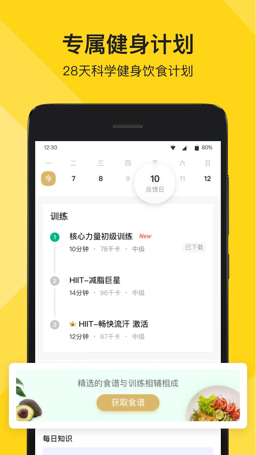 【超千万用户的健身选择】 Fit-你的私人健身教练,随时随地Fit一下,身材更有型。 无论你的目标是减脂、增肌还是塑形,Fit都能根据你的健身基础和日程,为你度身定制个人专属健身和健康营养饮食计划。 【会员0元练一年】 - 独享专业教练陪伴指导,给你一对一的训练建议,陪你一起进步,保证你精准进阶,效果稳稳达成; - 为你提供量身定制训练计划+营养指导,跟着练、跟着吃,养成健康好习惯,收获理想好身材; - 即刻解锁热门新课,随时随地打卡最流行、最全面、最高效的独家课程,跟练更流畅,轻松刷脂肪; - 在训练过程中,随时调整训练动作难度,满足从入门到进阶的训练需求,体验更灵活,效果不耽误。 【真人教练陪伴式指导】 - 担心动作没做对,发愁训练没效果?国际认证资质教练为你一对一指导,给你练前练后专属建议,让你练得尽兴、练出自信,高效达成训练目标; - 配合你的定制计划编排,为你提供针对性的反馈调整,保证你状态在线、精准进阶,省心又省力,让效果更明显; - 微信群组在线答疑,饮食+运动讲练结合,轻松突破每一个难点痛点; - 群内伙伴陪你同练,共同激励为运动充能,让运动快乐翻倍,健身再也不孤单。 【定制专属训练和饮食计划】 - 根据你的健身目标和基础,适应你的训练日程,100%为你度身定制四周个人专属训练计划; - 国家营养师团队,精心打造减脂饮食方案。结合专业运动方案,让你越吃越瘦; - 训练后智能反馈,分析训练表现和身体适应度,针对性调整后续计划,确保获得持续效果和快速进步; - 释放自身潜能,坚持训练,两周后感受显著变化。 【海量健身课程】 - 超过1200节健身课程:包含减脂HIIT、Tabata、增肌力量、HVIT、瑜伽、拉伸、热身、生理期、产后恢复、提升运动表现、体态纠正、康复训练…… - 超过800个训练动作:美国UnderArmour品牌健身导师-陈蕴(Jordan Chen)及专业教练标准视频示范; - 健身导师团队精心设计训练课程、合理编排训练步骤,更适合国人体质; - 不同时长的课程,匹配各种健身场景,支持离线训练,随时随地开启训练模式; - 高品质多机位训练视频,清晰呈现动作细节,轻松全面掌握动作要领,提升训练质量; - 真人语音督导,陪伴训练优质至优体验。 【真人教练金牌服务】 -「21天零负担减脂班」真人私教陪伴更好瘦,教你有效练、聪明吃; -「14天细腰马甲线冲刺计划」 挥别赘肉,秀一整个夏天; -「14天英雄腹肌雕刻训练计划」拥有引人膜拜的天神腰腹; -「14天维密美腿速成计划」 专业教练亲授美腿锦囊; 【大师课堂专业解读】 - 大咖级老师倾力提供更深入更专业的健身理论知识和内容干货; -超多好课持续更新中:新手健身第一课、女神必备:六招解决体型问题、核心训练-健身必修课、解决常见身体以及运动疼痛问题、减肥人群的饮食必修课…… 【记录训练数据】 - 训练打卡,健身历程全程跟踪,见证你每天的进步; - 有趣成长体系,训练不再枯燥,激励自己获得无穷动力; 【健康与饮食指南】 - 不同训练阶段,提供针对性饮食建议与健身指导,更快速有效达成健身目标; - 每日精挑细选优质高清运动健身短视频,给你学习健身知识和了解生活的新方式。 【热门训练课程】 1. 减脂:Burpee减脂训练班、HIIT-减脂大作战、Tabata-瑜伽垫减脂、哑铃全身循环-燃脂。 2. 腹肌:腹肌撕裂者、Tabata-核心大爆炸、HIIT-腹部燃脂、核心力量训练、核心进阶减脂。 3. 塑形:手臂纤细塑形、哑铃胸肌塑造、徒手背部塑形、蜜桃臀塑造、弹力带翘臀塑造。 4. 美腿翘臀:蜜桃臀塑造进阶、翘臀养成、HIIT-纤细双腿、臀腿拉伸、瘦腿训练。 5. 瑜伽拉伸:入门瑜伽伸展、肩颈伸展、完全拉伸、晚间助眠伸展、办公室舒压放松、秋冬手足温暖瑜伽。 6. 生理期、产后恢复:生理期全身循环练习、生理期舒压、肩颈放松、产后恢复训练-基础瑜伽、产后恢复训练-腹部塑形。 7. 增肌:俯卧撑速成、哑铃麒麟臂打造、哑铃臀腿塑形、哑铃胸肌训练。 8. 热身激活:有氧运动前热身、无氧运动前热身、晨练活力热身、跑步前热身。 9. 体态纠正:缓解腰痛、圆肩驼背、天鹅颈塑造、优美腿型。 10. 提升运动表现:篮球弹跳力训练、仰卧起坐满分训练、长跑通关训练。 Fit是一个动真格的私人健身教练,我们的目标是,在身体上和精神上塑造更好的你。 下载Fit,就此开始,塑造自己!SHAPE UP! ———如有需要请联系我们,获取更多信息———— 官方网站:http://www.fitapp.cn 新浪微博:@FitApp 微信公众号:FitApp 联系邮箱:love@fitapp.cn ———————————————————————