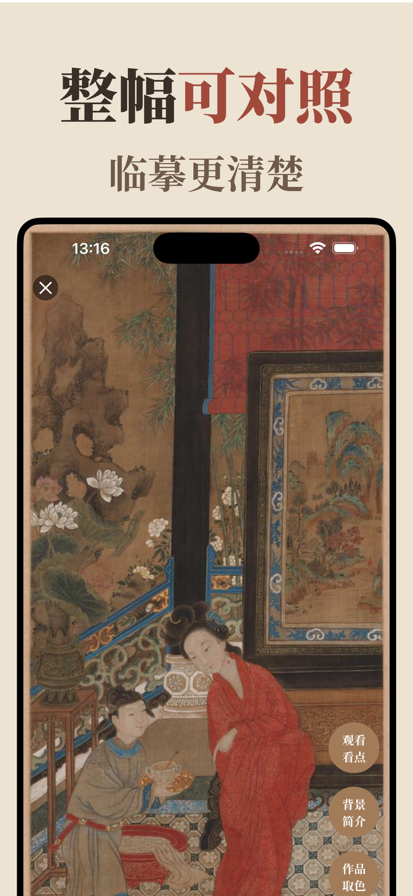 欢迎来到「一期一绘」 随时随地畅游于珍贵的经典字画之中。无论您是学者、历史爱好者还是对古代文化感兴趣的人,「一期一绘」都将为您打开一扇通往过去的大门。 在「一期一绘」中,您可以欣赏到数以千计的珍贵字画的高清扫描件,从古代典籍到手抄本,覆盖了广泛而多样的主题和时期。您将亲眼目睹文字和绘画的精湛之处,并深入探索当时的历史背景和文化传统。 每一次翻开,都是一次与古人灵魂相连接的奇妙旅程。 「一期一绘」为您提供了一个与古代智慧对话的平台,让您在当代生活中感受历史的魅力。 不论您是想进行研究、欣赏艺术还是满足好奇心,这个应用都能满足您的需求。 我们一起开启一段探索之旅,遇见那些承载着千年智慧的珍贵宝藏! ◆ “年度会员”为自动订阅模式。 1.付款:用户确认购买并付款后计入iTunes账号 2.取消订阅:如需取消续订,请在当前订阅周期到期前24小时以前,在iTunes/AppleID设置中关闭自动续费功能,到期前24小时内取消将会收取订阅费用 3.续费:苹果iTunes账户会在到期前24小时内扣费,扣费成功后订阅周期顺延一个订阅周期 ◆ 服务协议:https://ovd21e8m8mf.feishu.cn/docx/JXyMdHkd1oSSr8xecgtcZShknie