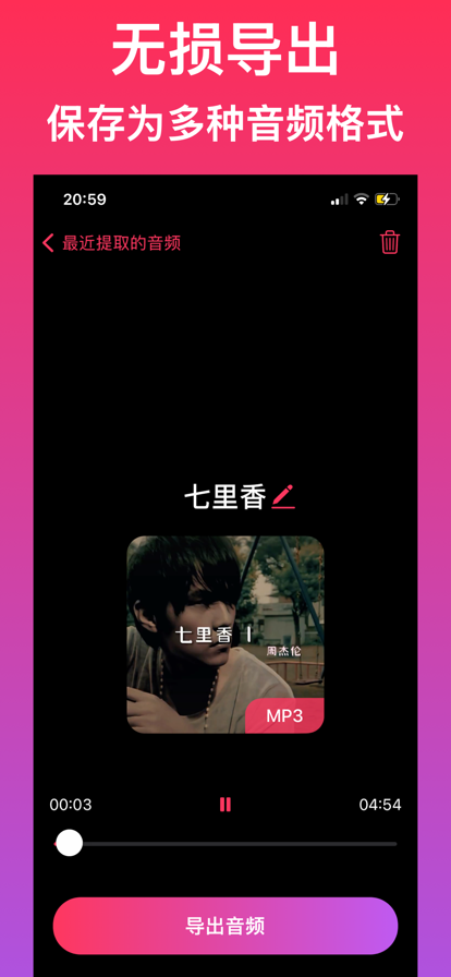 轻松提取视频中的音频,随时随地享受你的专属音乐片段! 【主要功能】 一键将视频转换为高质量MP3、M4A等多种音频格式 支持本地视频导入,快速提取所需音频 音频剪切、片段提取,定制你的专属铃声或BGM 批量管理、分享与导出音频文件 简洁美观的界面,操作流畅易上手 【适用场景】 提取电影、短视频中的精彩配乐 制作个性化铃声、闹钟或通知音 备份、管理你的音频素材库 【为什么选择我们】 极速处理,音质无损 支持多种格式与自定义参数 完全本地处理,保护你的隐私 快来下载体验,让音频提取和编辑变得前所未有的简单高效! 关于应用内购买: 部分功能可通过自动续订付费使用, 按月订阅价格为38元/周。 付款将通过iTunes账户进行。 除非在当前订阅期至少提前24小时关闭自动续订,否则订阅将自动续订。 购买后,请通过账户设置管理订阅。 在活动订阅期间,无法取消当前订阅。 隐私政策:https://docs.qq.com/doc/DRWpjUHlzQ0pxekJT 使用条款:https://docs.qq.com/doc/DRWxqclBOUEFoY0Nz 联系我们:audio_conv_help@gmail.com 如果从文件应用程序中提取的文件消失,可能通过重新启动设备来修复。 此外,如果出现提取错误,重新启动设备也可能会解决问题。 如果重新启动后仍无法解决问题,请尝试将视频从照片应用程序移动到文件应用程序, 然后尝试打开文件应用程序中的视频进行提取。 如果仍无法解决问题,请通过联系邮件发送出现错误的视频会很有帮助。也可以发送可下载的链接。 功能添加和改进建议正在接受评论! 我们会尽力进行响应!欢迎任何评论!