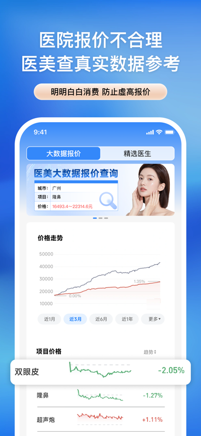 荣誉奖项: 1、第三届全球医学美容创新大会中国医美品牌100佳 2、新浪2018 年度杰出美学设计平台 3、第七届中国财经峰会医美行业影响力品牌 4、2023中国医美行业城市榜(成都)创新大奖 5、2024年度医药/医美抗衰影响力企业top前10 6、2019中国十大信任力医美互联网 7、2018新浪年度杰出美学设计平台 此软件提供全国3万家正规医院的医美整形价格查询、医院医生黑白名单查询、医院医生资质查询、医美仪器验真查询、医美项目优惠信息查询、医美整形案例原生案例查询以及整形方案定制查询功能 【医美整形价格查询】免费的整形报价器还不会用?上医美查APP,3秒出查询结果! 【医院医生黑白名单查询】想整形,选医院太难?一键免费查询医院白名单,拒绝吃亏! 【医院医生资质查询】别再被整形医院坑了,整前查询医院资质,整形不走冤枉路! 【医美仪器验真查询】做了热玛吉没效果?用真伪查询功能查一下,可能做到假的了! 【医美项目优惠信息查询】输入项目和城市,即可查询当地整形医院的优惠信息,提前了解价格 【医美整形案例原生案例查询】整形案例太假,找不到真实案例?上医美查看她们的整形全流程案例! 【整形方案定制查询】双眼皮做全切还是埋线?症状不同,适合的手术方式不同 --------用户好评-------- 评论人:bbvhhjg – 2021年3月18日 在平台下单的抽脂,派的医院就在市区。主任医师给抽的-看了他家吸脂案例还不错,就趁着年前赶紧做了。抽了好多的呢,上手术室就睡着了,出来后身上包得紧紧的,不知道什么时候醒来的!自己下意识的摸了下大腿,感觉有瘦了一圈!心中窃喜~然后要护士把脂肪的照片发过来!护士说瘦了好多。现在恢复中,希望瘦的越多越好 评论人:ocmp4 – 2021年3月16日 已经打完瘦脸针两个多月了.效果还是棒棒哒~咬肌这个东西真的是不处理它不行。照相的时候它就是得P图,真的是麻烦。不过,还好有肉毒素这种东西,真是去除咬肌的好帮手。我打的是保妥适的,我觉的效果还不错哦, 评论人:ohslacliu – 2021年3月7日 拆完线眼睛就不怎么肿了,身边人都觉的我恢复的特别好,术后自然有神~特别是拍照时特别好看,闺蜜都说也要去做。以前老是不能下定决心,现在觉得确认想要双眼皮就去割吧~早做早美、现在看以前的图片只想删掉删掉,给美呗点赞,非常靠谱,没有瞎推荐~ 评论人:个升时的那候 – 2019年12月20日 接触整形已经快5年了!不过之前只敢做水光针、玻尿酸、纹眉这类小项目!也有过不愉快的经历!现在这个app用了很久了!前几天刚割了双眼皮、垫了鼻子!真的觉得自己越来越美了~ 评论人:神0精质体 – 2019年12月19日 医美查是一个非常贴心的医美整容应用,作为一个热衷美容整形的人,能够和大家分享自己的经验和所得,真的很开心.这里真的是一个专属于90后的app,年轻人的聚集地。