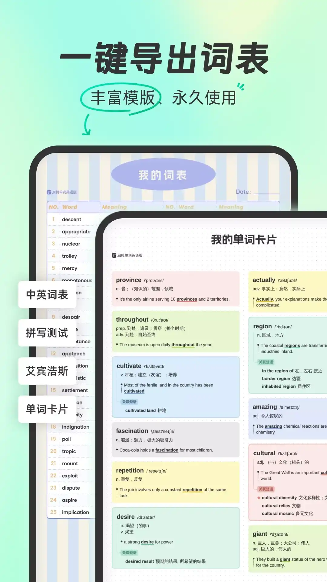 扇贝单词:记得住,更能「应用」与「得分」 不只是背单词,更是一套完整应对英语考试的学习方案。 从 AI 精简任务,到真题语境与题型训练,扇贝让你在有限备考时间里,每一步都更有效率。 • 14年深耕单词记忆研究,累计注册用户超 2 亿 • 专注服务考研、四六级、雅思&托福、中高考等考试人群 • 教育类应用中长期保持高好评率 扇贝自研专利「精简单词智能系统」,通过词汇量测试,科学预测并筛除你大概率已掌握的单词,显著缩短学完整本单词书所需时间(专利号:ZL 2024 1 1008490.X),减少无效学习,更快进入实战阶段。 扇贝率先接入DeepSeek等前沿AI大模型,推出「词文串学」功能:根据你当日所学单词、记忆水平和考试目标,智能匹配外刊同源短文,在真实语境中巩固记忆。 【AI 智能规划:少背、快背、背对】 超越固定的艾宾浩斯遗忘模型,扇贝通过 AI 分析历史学习行为,为你规划更贴合个人记忆特征与备考阶段的学习路径。 • 动态抗遗忘:提前预测遗忘节点,自动安排复习,避免「学过却在考前忘掉」 • 难词定向突破:聚焦反复出错的单词,提供词汇串讲与助记方案 无论你处在备考初期、稳定复习期,还是考前冲刺期,都能在扇贝找到适合自己的学习节奏。 【从「会背」到「会考」:提前进入考试状态】 你的每一次学习,都是在为考试做准备。 • 短文填词:基于已学词汇,自动生成首字母填空、选词填空等高频考试题型,背词与刷题同步完成 • 支持导出 PDF:用于集中刷题或打印复习 • 试卷字体:单词详情页、阅读与短文填词可切换为试卷字体 • 单词草稿纸:支持平板同屏书写笔记,随时拆词、标注与推导,不切换应用,不打断思路。 【覆盖主流考试的专业词书与权威内容】 • 全面兼容知名实体书籍,覆盖小学、初中、高中、大学英语四六级(CET-4/6)、考研、雅思(IELTS)、托福(TOEFL)、GRE、GMAT、SAT、BEC 等主流考试 • 精简意义,标注考频,并提供源自历年真实考题的例句,你学的就是你要考的 • 提供 医学、计算机、金融、法律等专业领域词书,满足进阶学习与职业需求 • 支持上传自定义词表,一键生成专属词书 【多维巩固与长期激励:让坚持变得很容易】 • 上千万用户贡献的高质量助记,提升记忆效率 • 支持拼写、听写、复述、极速刷词等多种训练方式,循序渐进,强化掌握 • 学习同桌、组队打卡、长期战队,随时get备考搭子带来的正向反馈 即刻下载体验更多功能! 联系我们: 应用内:扇贝单词英语版APP-「我的」-「帮助与反馈」 小红书官号:@扇贝单词 邮箱:help@shanbay.com