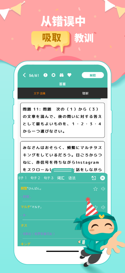 【真题模拟】 涵盖2000年7月-2024年12月《JLPT真题》, 2010-2024《高考真题》 ,2009-2024《日语考研真题》,2005-2024《专四真题》,可以掌上模拟测试. 【听力精听】 听力翻译, 精听, 变速, 听抄, 注音 , 泛听, 提升听力全靠它了! 【真题解析】 历年真题 + 翻译 + 解析, 将考点分析透彻! 【背单词】 根据艾宾浩斯记忆曲线, 卡片式记单词, 牢牢记住每个单词! 【学语法】 根据艾宾浩斯记忆曲线, 卡片式和倒推式学习, 深度理解每个语法! 【长按查词】 有不懂的词,点击一下, 即可以查看释义, 简单方便. 【错题&收藏】 错题自动收录, 生词, 陌生语法, 统统都可以收藏! 【题型分类】 将文法, 文字词汇, 读解, 听解独立出来, 方便针对性的练习. 【笔记功能】 单词, 真题, 语法 支持添加笔记, 写入自己的理解! 【标记&翻译】 标记和翻译的内容都会记录下来, 方便随时查看. 【精选资讯】 为您提供额外的阅读内容. 【搜搜搜】 搜索你要的单词, 语法, 真题, 变形! 【跟读】 选择想要的跟读内容进行跟读练习, 提升口语能力. 【随机真题】 自行选择分类, 针对性随机抽取题目, 巩固提升! 微信公众号:shaobingriyu