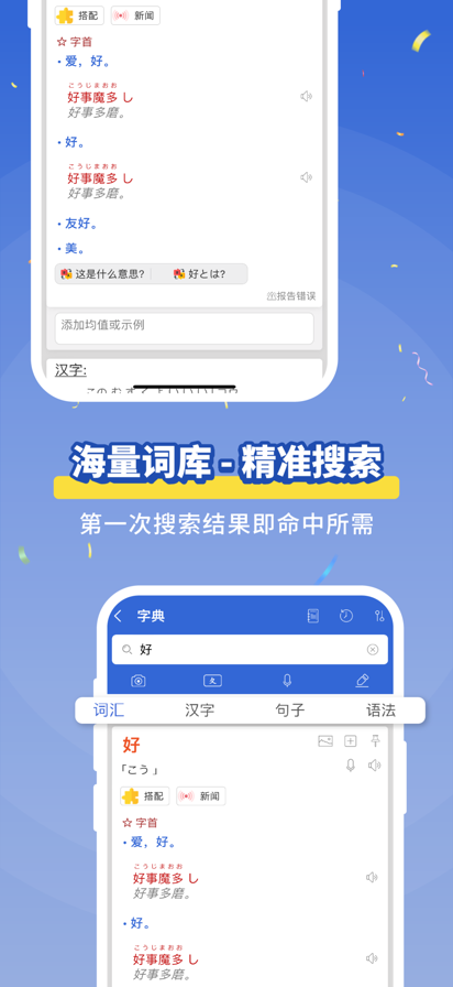 这款全球数百万用户下载的教育类应用程序,助您轻松学习日语,备战日语能力考试 (JLPT)!Mazii 是一款免费的日语词典,集成了汉字练习、日汉词典、汉日词典、日语语法词典以及包含超过 10,000 个单词的词汇笔记本等强大功能。最常用的日语词汇…… 这款应用程序是一款功能强大的日语学习工具,拥有全面的学习功能,适合从初级到中高级各个级别的学习者,助您自信地掌握日语。 无论您学习日语是为了准备旅行、辅助学习、提升职业技能、与亲朋好友交流,还是仅仅为了娱乐,您都会喜欢使用 Mazii 进行学习。 Mazii——一款功能全面的日语词典,为您提供: - 一个完整的数据库,包含词汇、释义、汉字、词语分类等,并持续进行审核和更新。 - 一个日语学习社区,提供内容推荐、讨论等服务。 - 一套全面的工具和实用工具系统,支持听、说、读、写所有技能,涵盖日语能力考试(JLPT)N5-N1级别。 为了帮助用户更好地理解和准确使用日语,我们提供以下功能: 1. 便捷的日语搜索和翻译: - 通过摄像头、语音或手写输入,使用智能搜索和翻译工具。 - 全面的词汇搜索功能,支持日语、越南语、拉丁语和平假名。 - 包含完整含义、用法和书写信息的汉字词典。 - 包含例句和详细解释的语法词典。- 提供带有错误检查和语法分析的详细翻译,避免因翻译错误或浪费时间而感到担忧。 2. 来自日语学习社区的重要贡献: - 与日语学习社区互动交流,分享学习经验…… - 用户更新和贡献的日语学习资料,确保您始终拥有最新、最准确、最实用的信息。 - 解答您关于日语、日语学习方法等所有疑问。 3. 高效的词汇和汉字学习: - 包含汉字及其书写方式的全面汉字词典。 - 包含超过10,000个最常用词汇的词汇手册,按学习级别分类。 - 提供词汇闪卡、小测验和测试,帮助您更轻松、更有效地学习词汇和汉字。您可以随时随地练习。 4. 技能练习及附加功能: - 通过包含词汇的简短对话练习日语发音和听力理解。 - 超过10,000个由母语人士录制并配有日语字幕的视频,帮助您练习听力和口语技能,更有效地提高听力水平。 5. 日语能力考试 (JLPT) 模拟测试: - 提供超过100道基于N1-N5考试形式的JLPT日语考试样题,帮助您练习JLPT日语考试。 - JLPT考试系统分为多个级别,并设有倒计时和详细的解释说明。 6. 练习阅读报纸: 为了提高您的日语阅读能力,您可以使用此应用程序阅读每日报纸文章。这有助于您扩展词汇量并快速掌握新信息。 隐私政策:https://mazii.net/privacy-policy.html 使用条款:https://mazii.net/terms-of-user.html 您还可以使用Mazii日语词典的在线版本:https://mazii.net 如需直接支持,请通过电子邮件联系我们:support@mazii.net