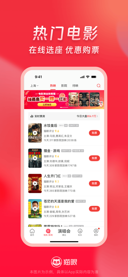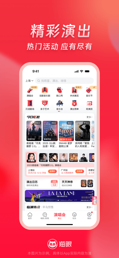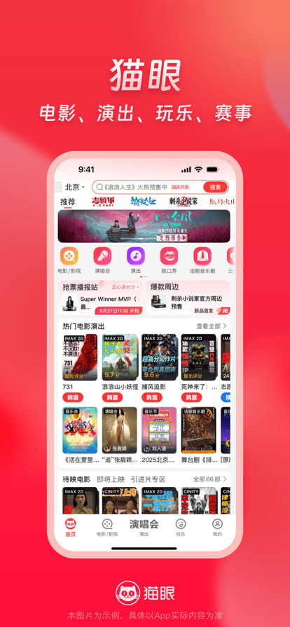 丝滑抢票上猫眼,优惠活动享不停! 【演出抢票超轻松】热门明星艺人演唱会、音乐节、电竞体育赛事、脱口秀、话剧音乐剧、休闲展览等演出订票so easy,信息精准推送不迷路~ 【影讯更新快又全】电影购票、选座超便捷,最新影视资讯统统有,票房口碑一眼知,还有明星见面会福利哟~ 【吃喝玩乐一站通】周边休闲玩乐美食团购全都有,热门景点、密室逃脱、美食、KTV等嗨不停。 意见和建议联系我们: 官方新浪微博:@猫眼电影 @猫眼演出 官方微信:电影演出票 猫眼电影 猫眼电影演出玩乐 猫眼演出票 猫眼演出 官方网站:http://www.maoyan.com/ 全国客服热线:1010-5335