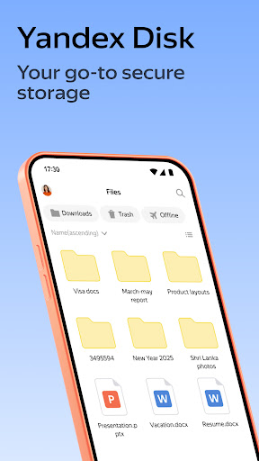 Yandex Disk 是一款云存储服务,用于存储您的所有文件、照片、视频和文档。照片存储专为日常使用而设计,是注重可靠性和便捷性的用户的理想之选。您的文件和图库始终可用,自动同步功能让您在任何设备上都能即时访问。<br><br>5GB 免费空间<br>所有新用户均可获得 5GB 免费空间。Yandex Premium 套餐最高可升级至 3TB。这使得云存储成为照片、文件和视频的完整存储解决方案。<br><br>照片和视频自动上传<br>照片存储自动在云端进行。便捷的自动同步功能让您无需手动整理图库:照片和文件会自动上传,而云照片存储则能保障您的珍贵回忆安全无虞。即使您的设备丢失或损坏,您的图库依然受到保护。<br><br>在任何设备上访问<br>您的照片存储始终与您相伴:无论是在手机、平板电脑还是电脑上。自动同步功能运行迅速,云存储还能为您提供额外内存,无需手动传输文件。只需轻轻一按即可打开图库,照片存储安全无虞。<br><br>智能搜索和文件管理器<br>该服务包含智能搜索和内置文件管理器。输入关键词,您的图库或照片存储即可立即找到所需文档。自动同步功能可轻松保持文件更新,而文件管理器则使云端操作简单直观。<br><br>轻松分享<br>将照片、文档和文件存储在云端,如果可以共享,则更加便捷。您的图库和云照片存储允许您生成链接并将其发送给同事或朋友。<br><br>在线编辑器<br>文件管理器还支持直接在应用中创建和编辑文件。您的图库和照片存储随时可用,自动同步功能使团队协作更加轻松。<br><br>无限照片和视频存储空间<br>使用 Yandex Premium 会员,您可以无限量地自动将照片和视频上传到云端照片存储。将照片存储在云端不会占用您的手机空间:所有文件都将保持原始画质。您的图库和自动同步功能在后台无缝运行。